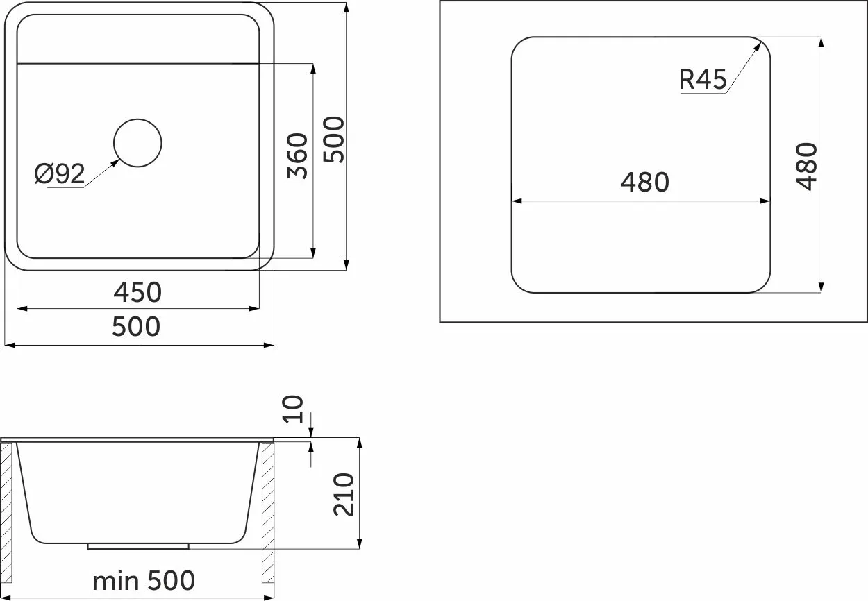 Мойка н/сталь, квадратная одночашевая, 500*500мм, мат сатин, PVD, врезн на/вровень столешнице, AKS (3,2мм)