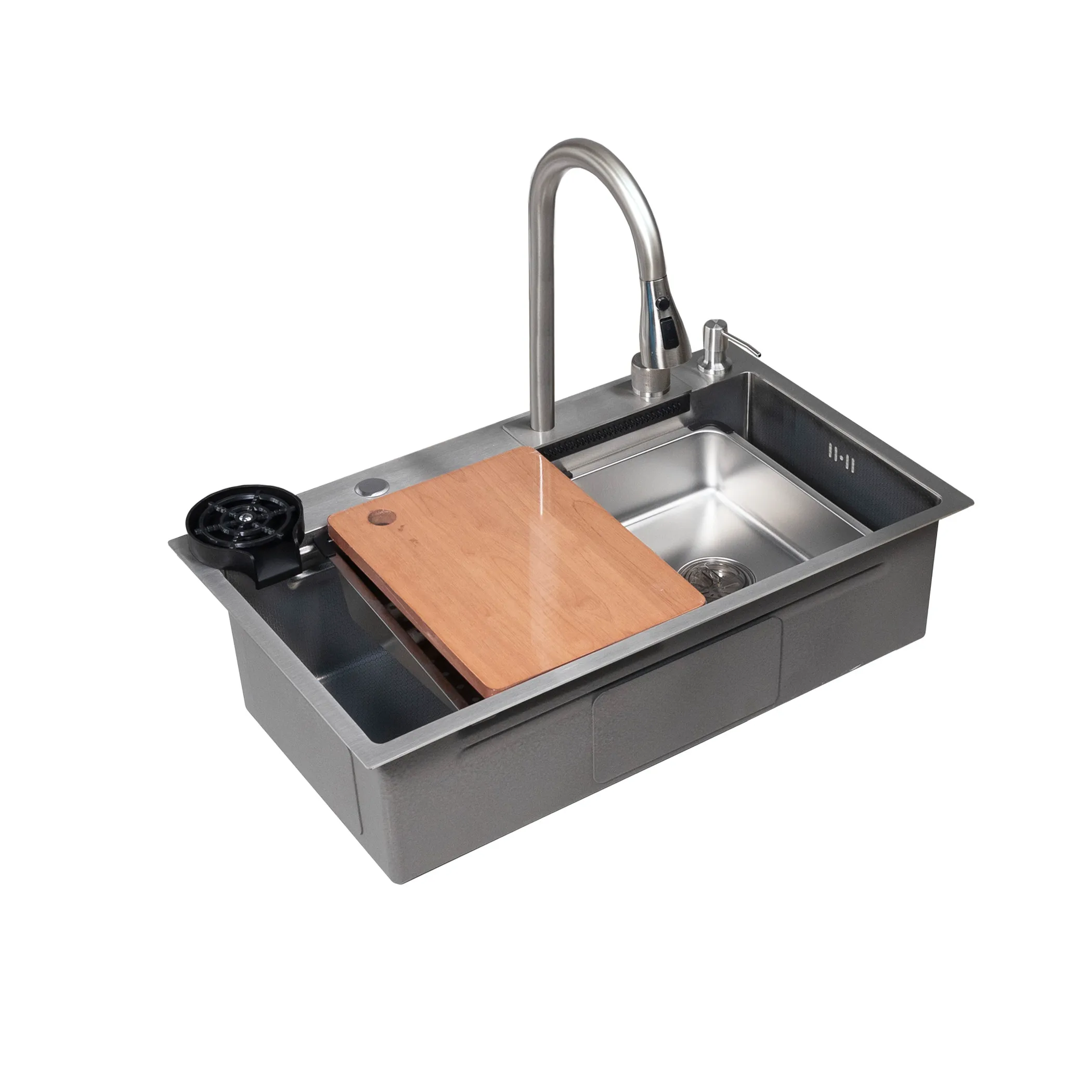 - в комплекте: мойка, смеситель с "водопадом", ринзер, коландер 2 шт, разделочная доска, сифон, крепления, дозатор для мыла;