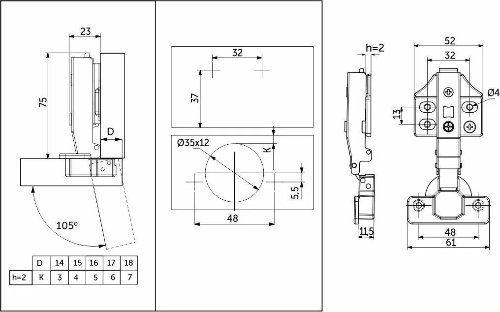 Данная петля подходит для фасадов толщиной до 22мм, имеет межцентровое расстояние между отверстиями в чашке в 48мм, а также высоту монтажной планки h2.