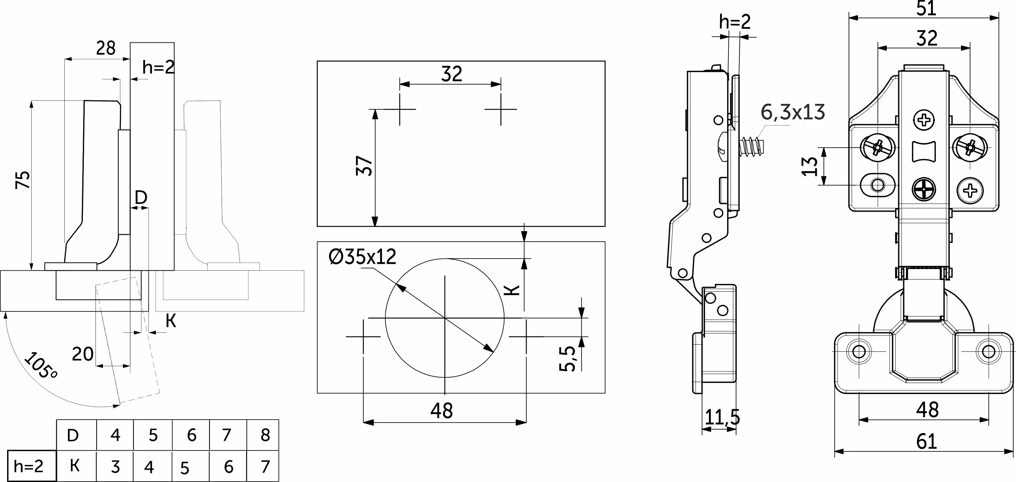 Данная петля подходит для фасадов толщиной до 22мм, имеет межцентровое расстояние между отверстиями в чашке в 48мм, а также высоту монтажной планки h2.