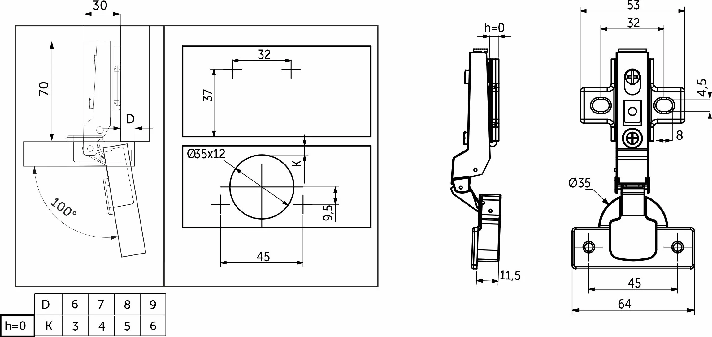 Изготовлена из холоднокатанной стали. Диаметр чашки петли составляет ∅35 мм. Глубина чашки 11,5 мм. Глубина сверления, необходимая для установки, 12 мм.