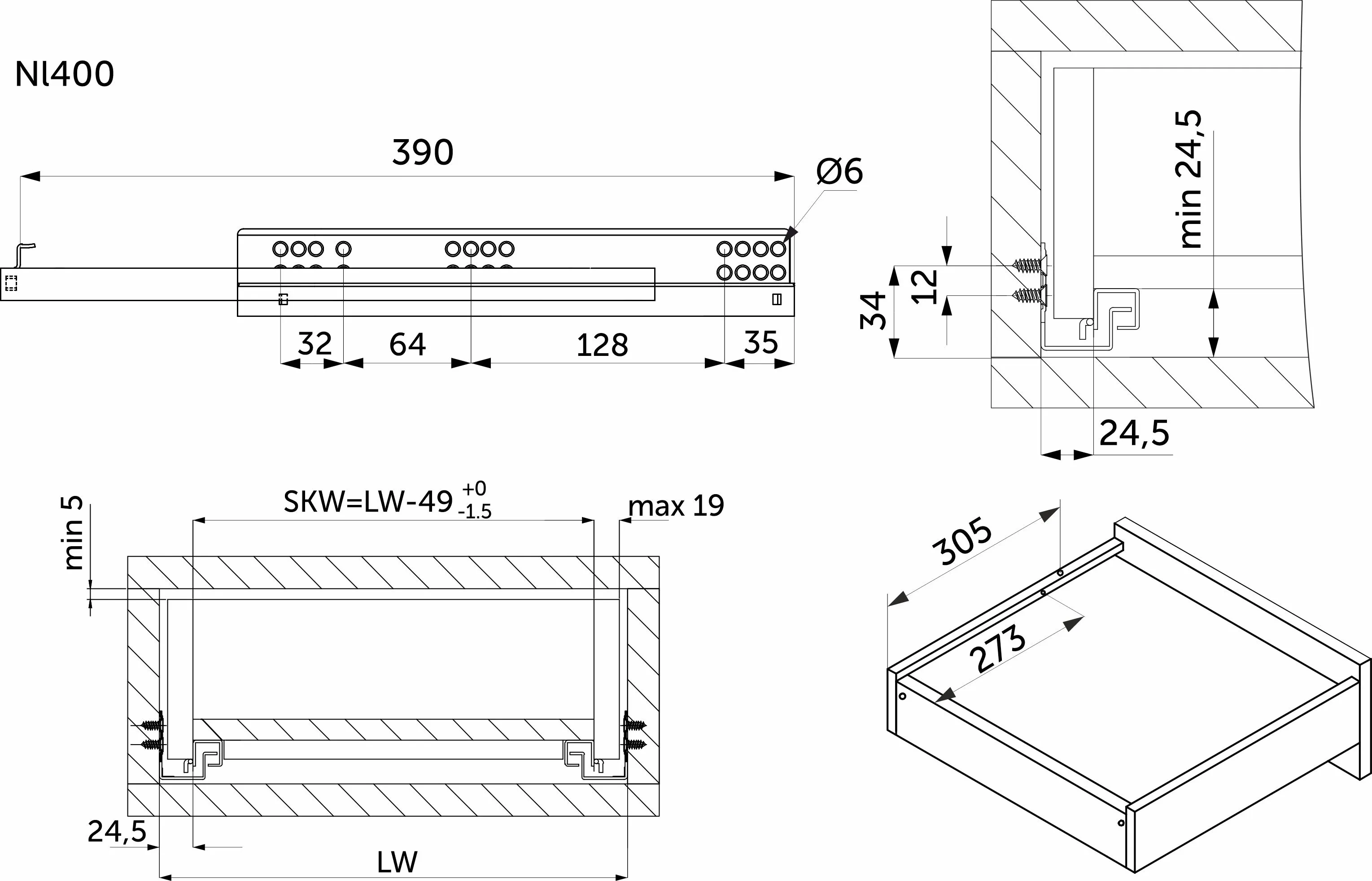 Направляющая скрытого монтажа L-400 с доводчиком ДСП до16mm насадной монтаж AKS 3/4 с фиксаторами