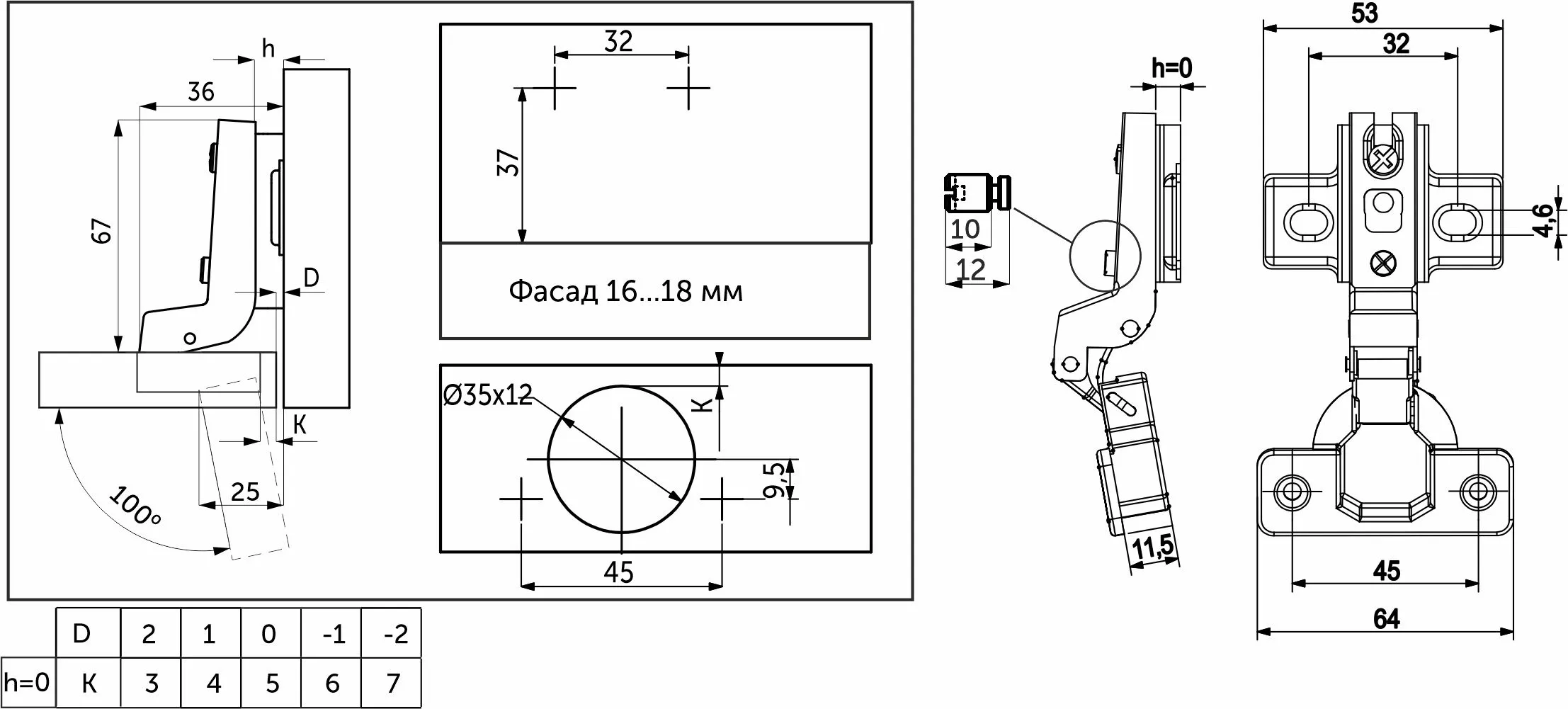 | Угол открывания, ° | 100 |
