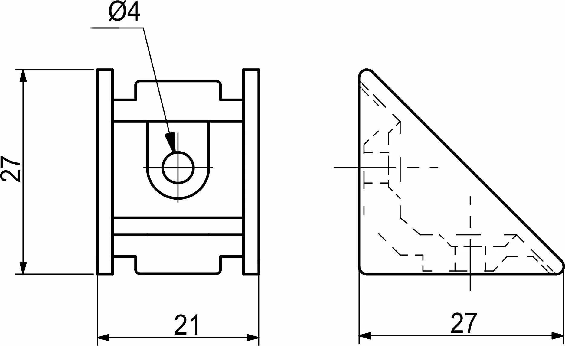 Один из видов одинарных пластиковых уголков (командорок), который имеет прикрепленную крышку. Данный уголок представлен в нескольких цветах, чтобы можно было подобрать к определенному цвету ДСП, и имеет треугольную форму. Данный вид соединения менее прочен, чем металлические уголки, но данные недостатки компенсируются низкой ценой и разнообразием цветов.