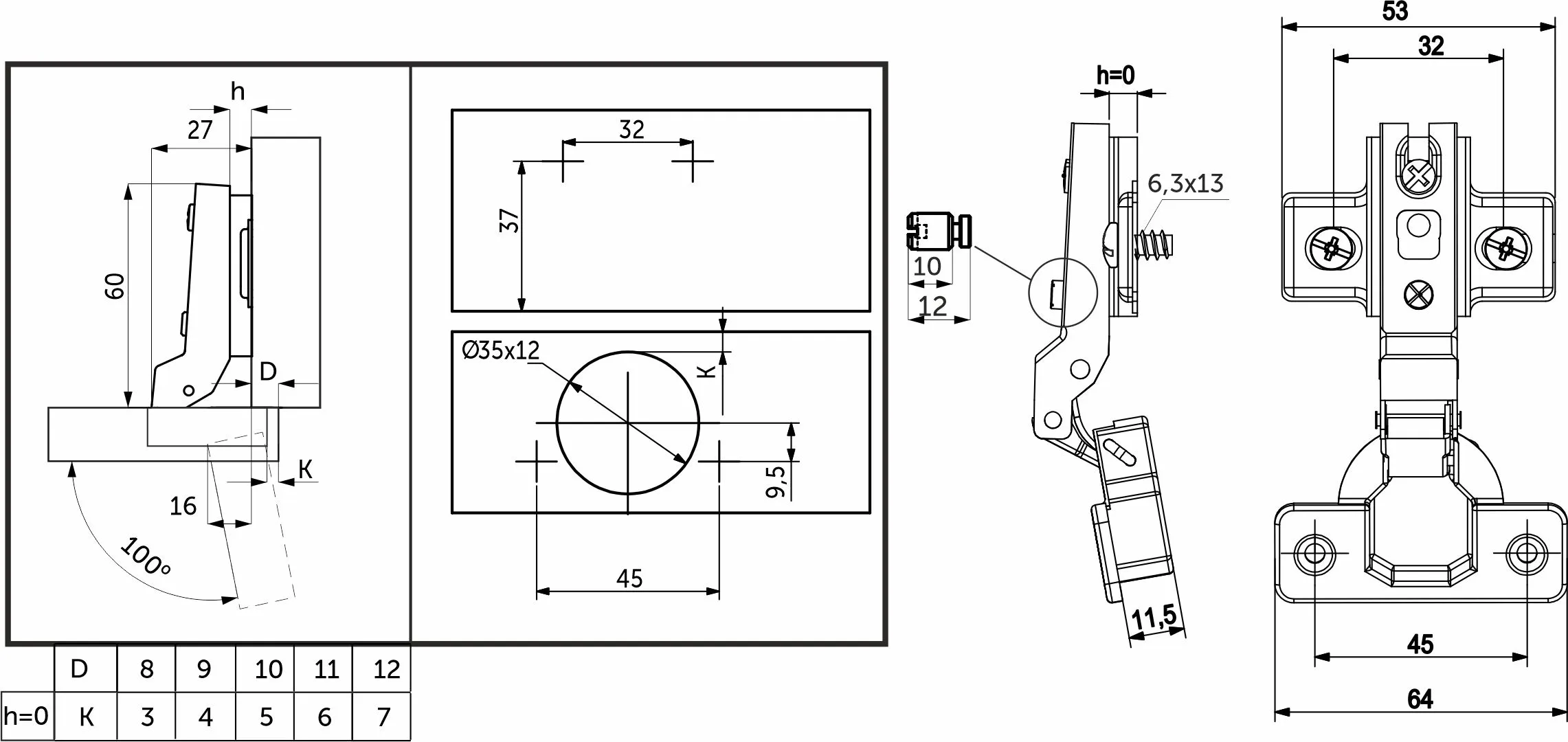 Изготовлена из холоднокатанной стали. Диаметр чашки петли составляет ∅35 мм. Глубина чашки 11,5 мм. Глубина сверления, необходимая для установки, 12 мм.