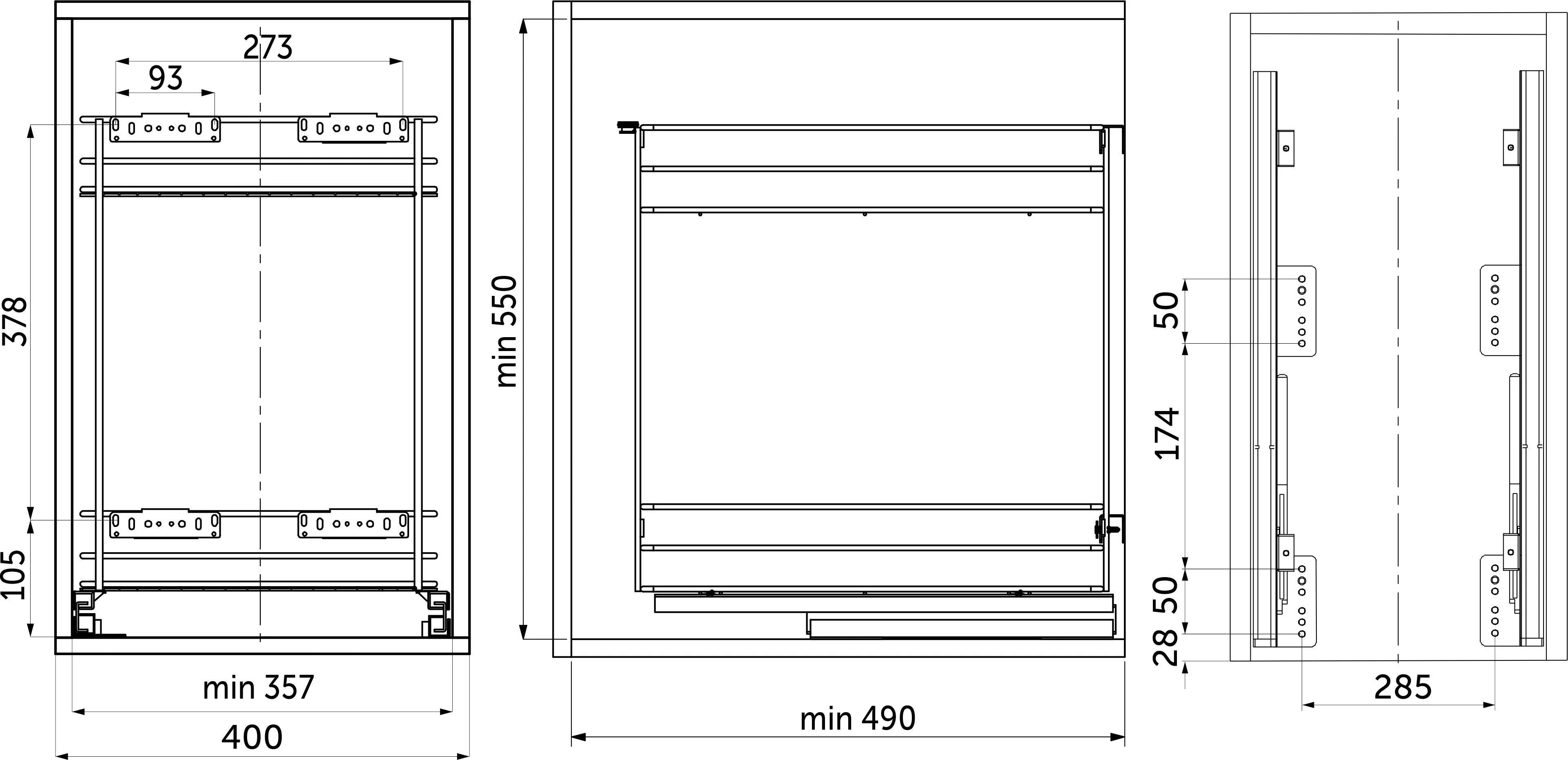- направляющие скрытого монтажа с доводчиком полного выдвижения с нагрузкой до 20 кг нижнего крепления (крепление ко дну ящика позволяет устанавливать корзину в уже собранный ящик),