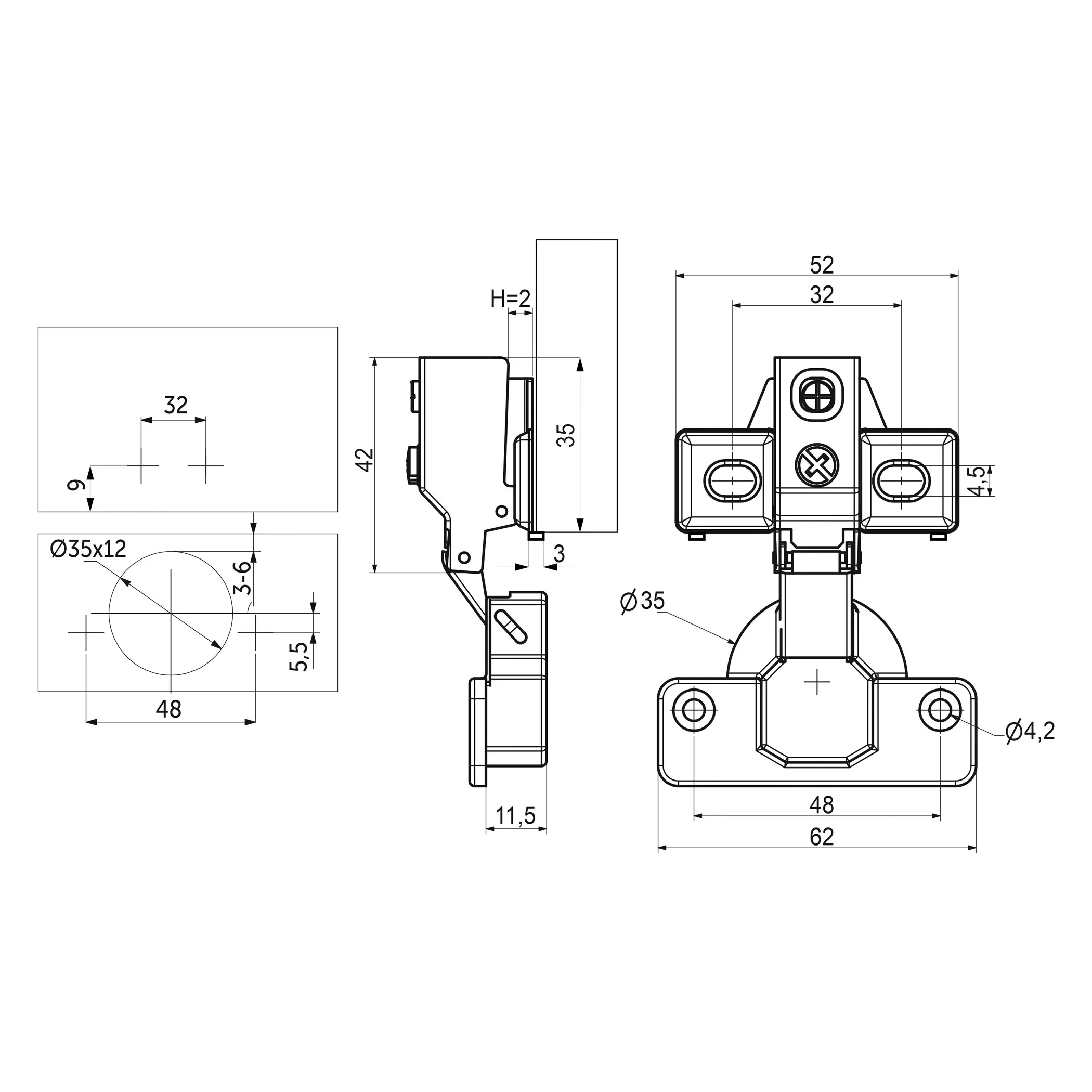 Изготовлена из холоднокатанной стали. Диаметр чашки петли составляет ∅35 мм. Глубина чашки 11,5 мм. Глубина сверления, необходимая для установки, 12 мм.