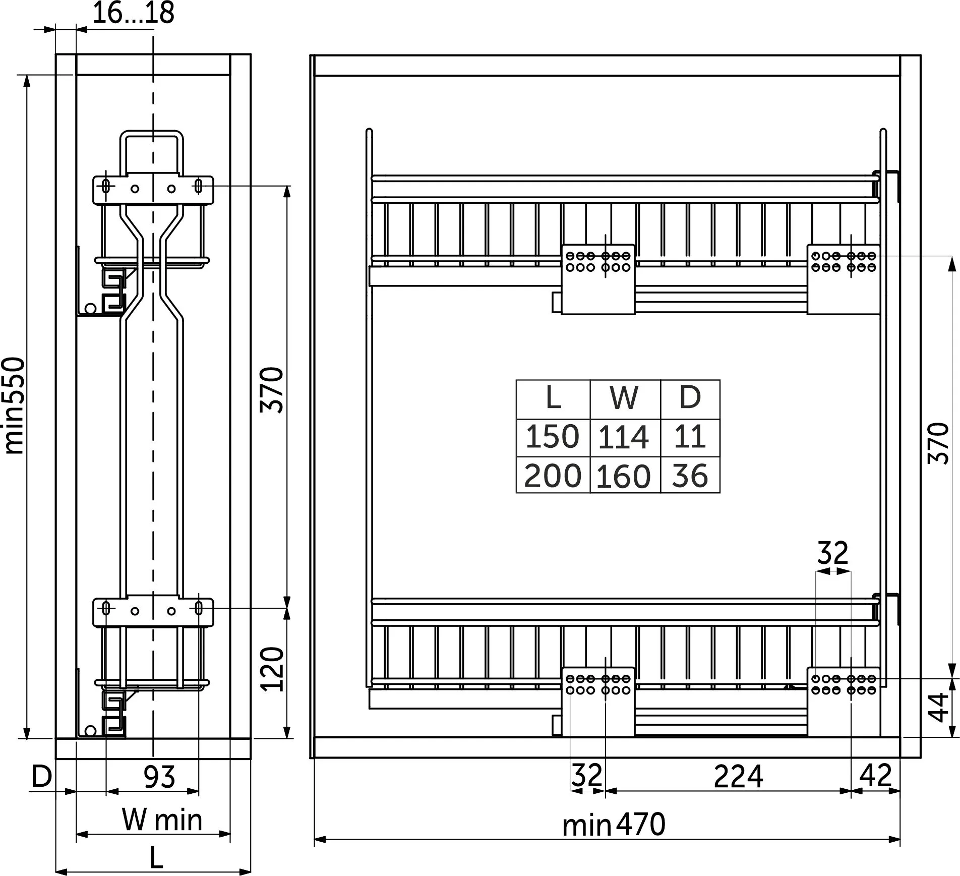 Выдвижная корзина-карго 150 крепл.боковое/универс. без доводчика, черный GRIDLI