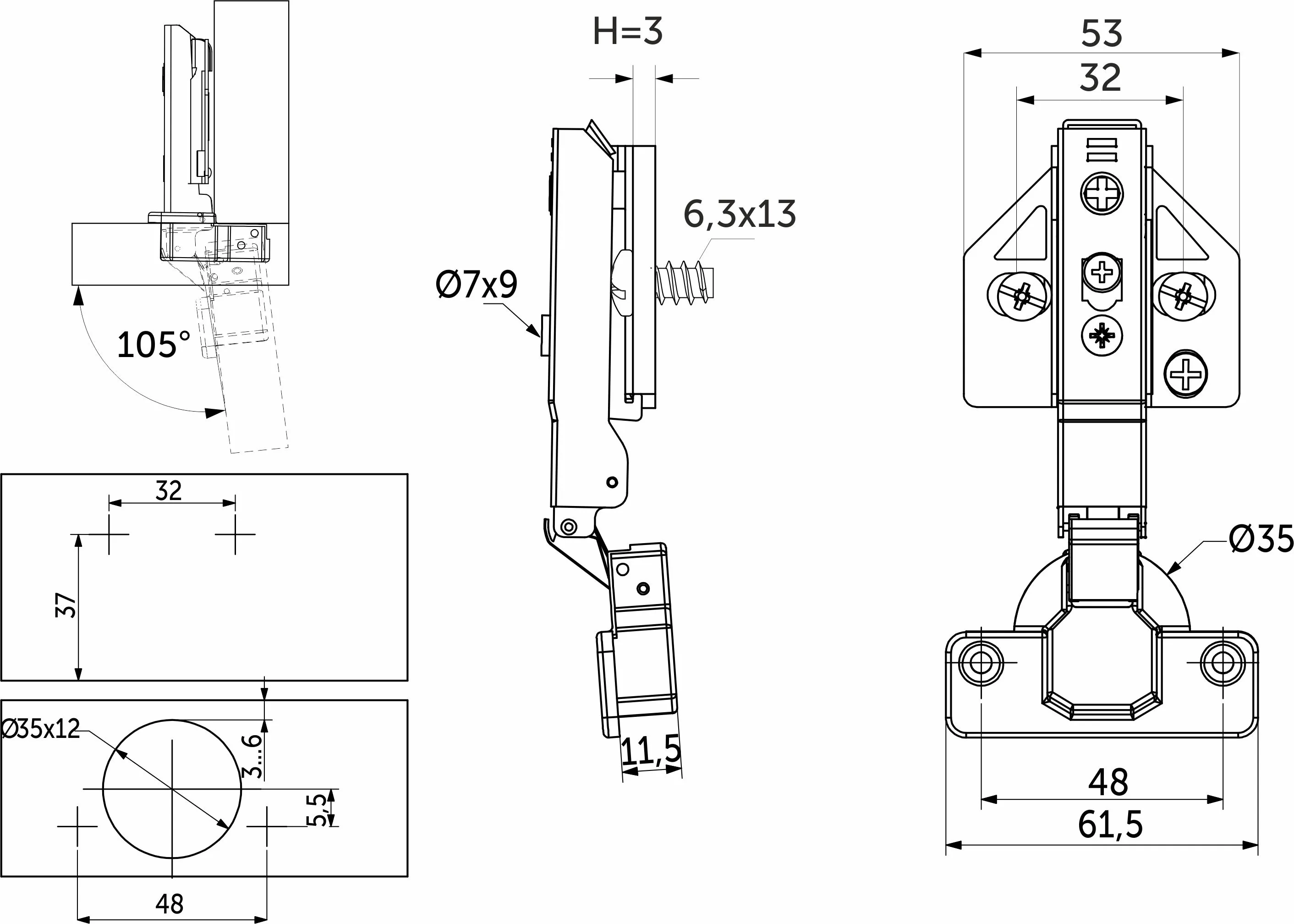 Имеет современную систему регулировки в трех плоскостях по +/-2-4 мм при помощи эксцентриковых винтов в планке и теле петли. межцентровое расстояние в чашке 45 мм и 48 мм.
