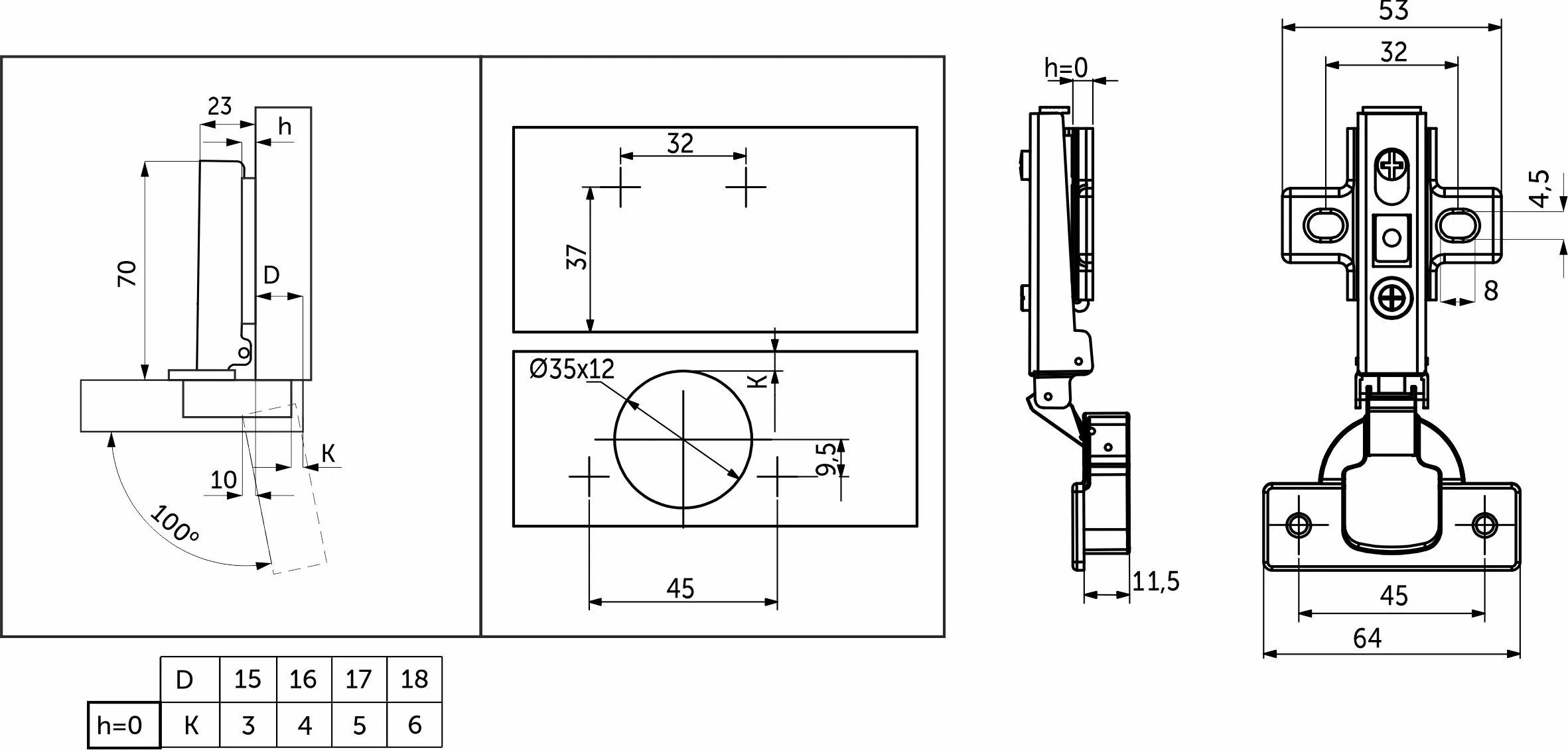 | Угол открывания, ° | 100 |