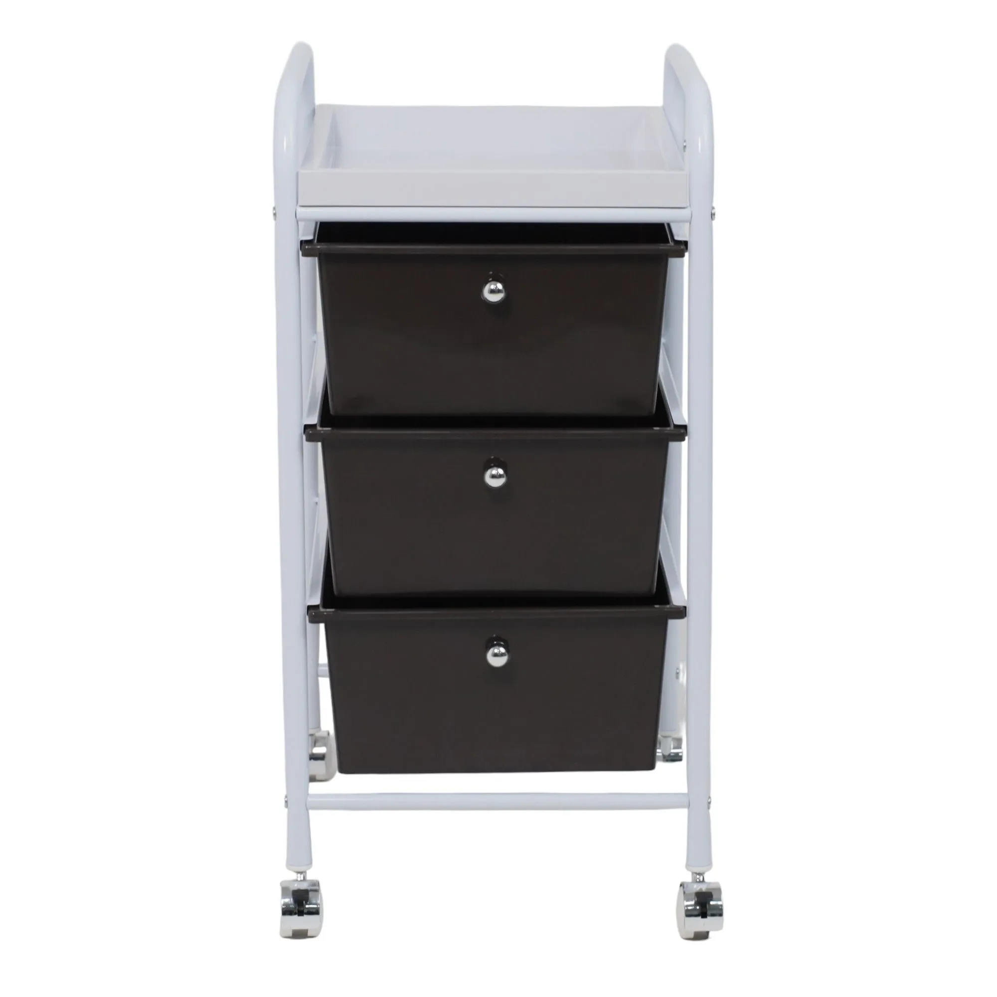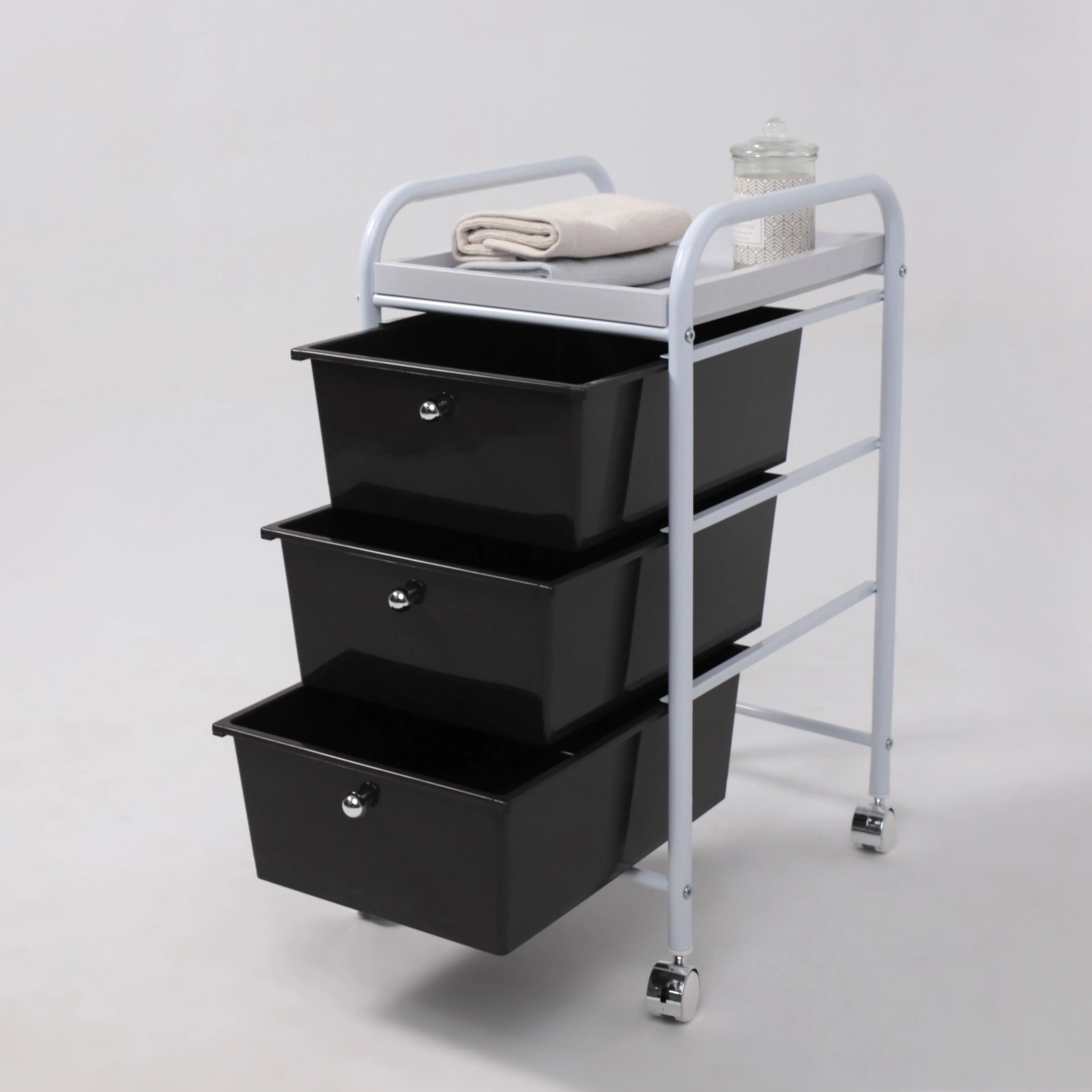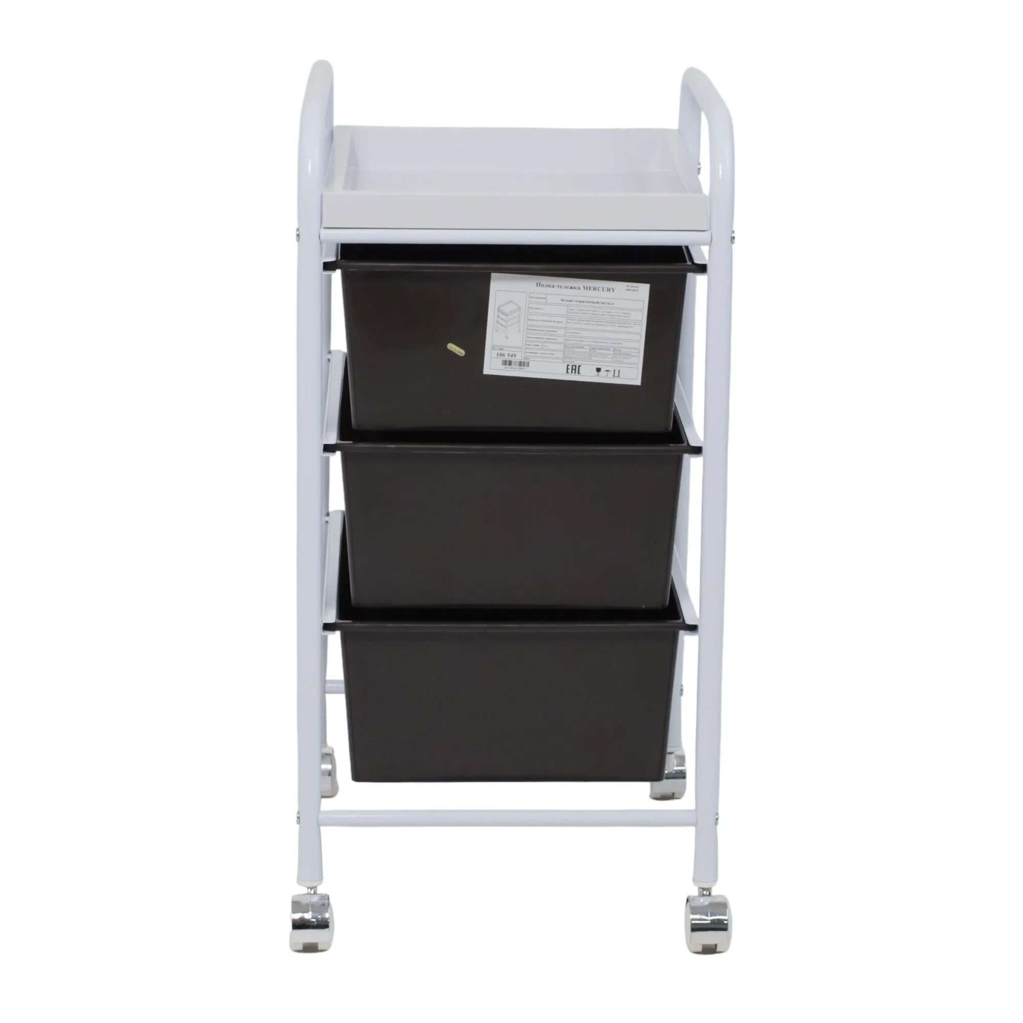 Полка-тележка MERCURY – компактный и вместительный предмет интерьера. Будет полезен в любом комнатном пространстве: в ванной, детской, спальне, прихожей, рабочем кабинете. Также пригодится в салонах красоты, гостиницах. Полка-тележка имеет несколько секций для хранения: 3 удобных ящика и верхнюю полка из АТS пластика. Основание тележки изготовлено из металла. Наличие колесиков позволяет легко перемещать тележку в удобную для Вас локацию. Размеры тележки: ширина 330 мм., глубина 400 мм., высота 660 мм. Размеры ящика: ширина 290 мм, глубина 390 мм, высота 140 мм.