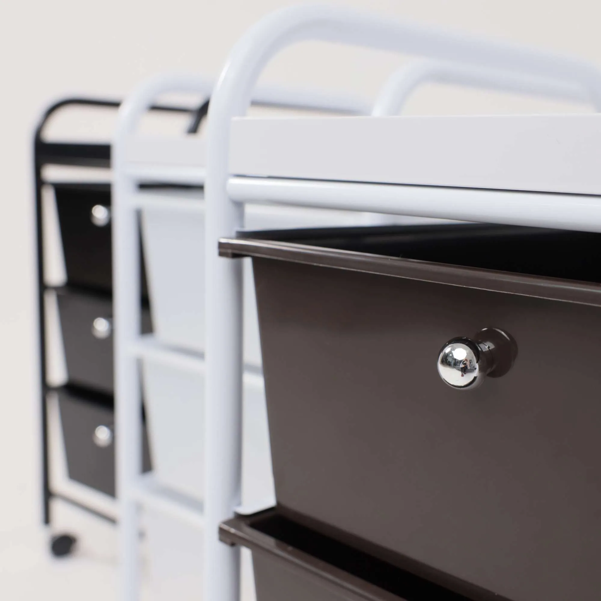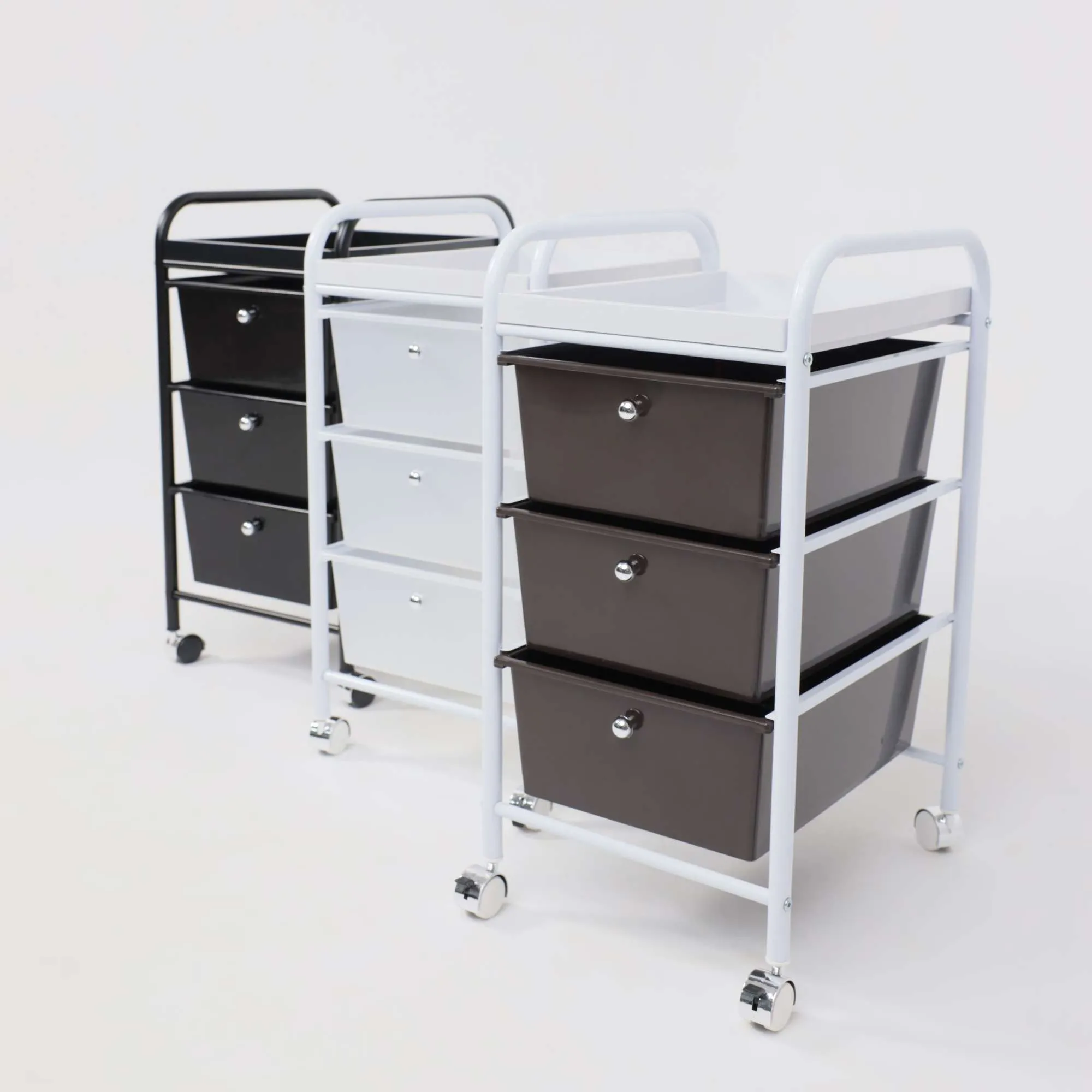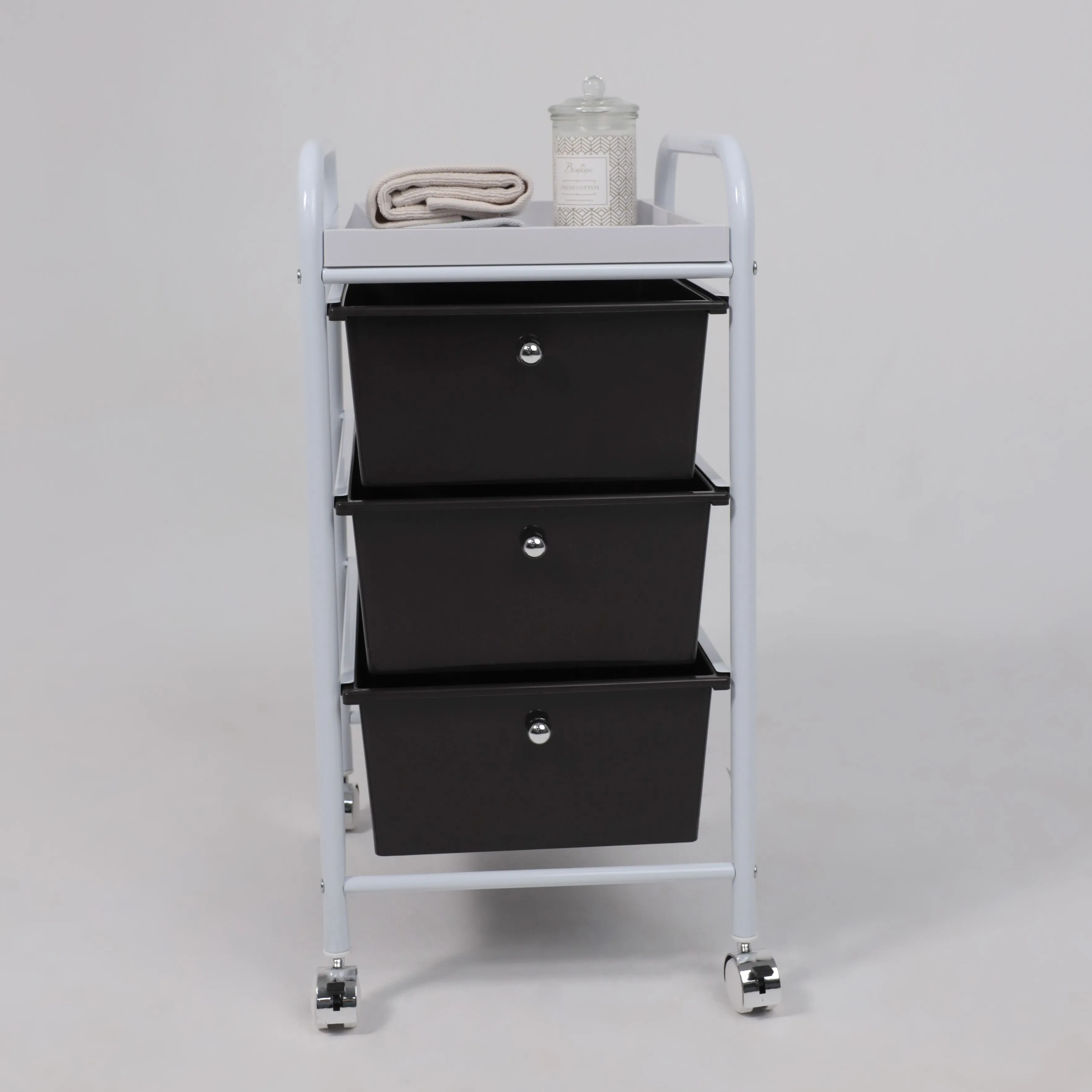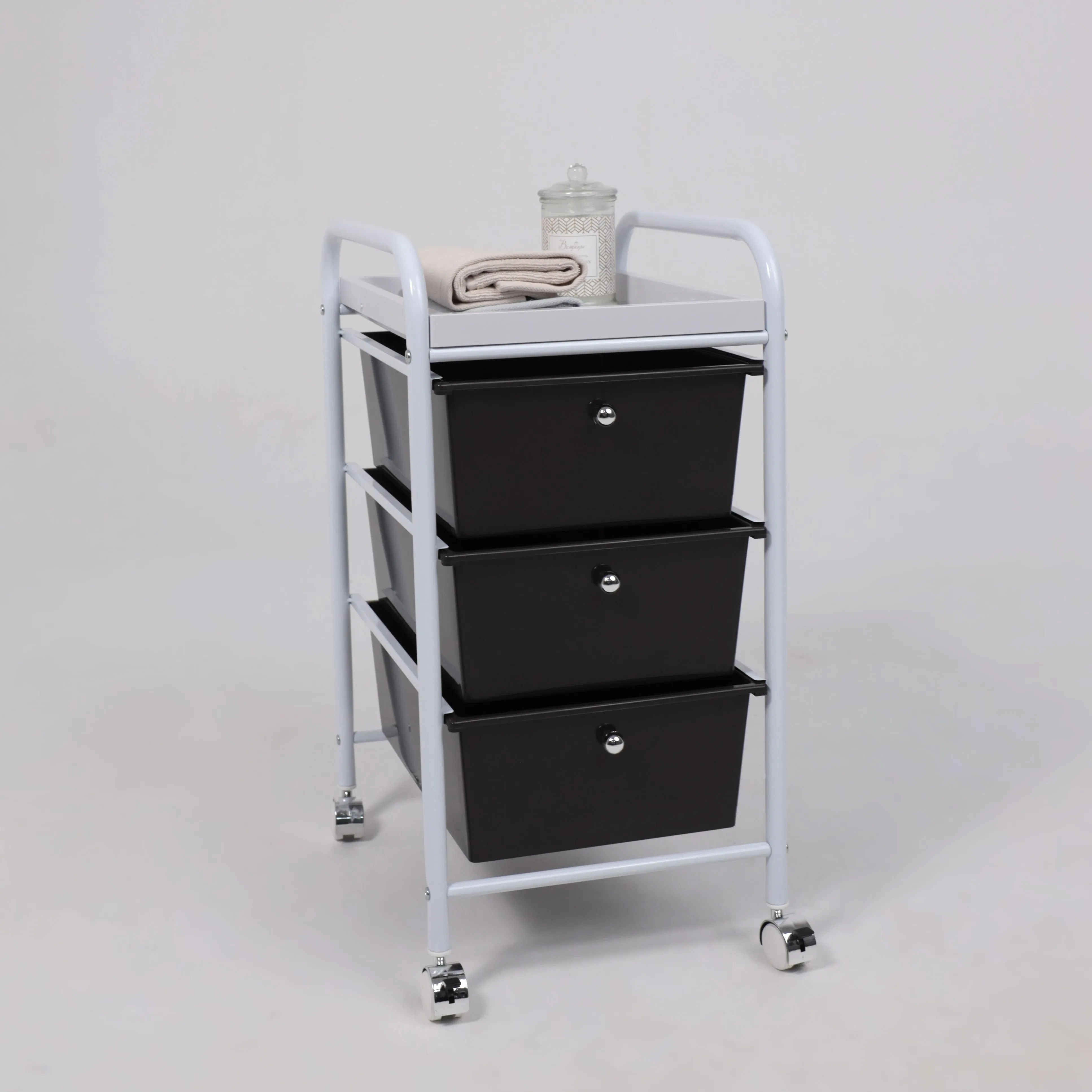 Полка-тележка MERCURY – компактный и вместительный предмет интерьера. Будет полезен в любом комнатном пространстве: в ванной, детской, спальне, прихожей, рабочем кабинете. Также пригодится в салонах красоты, гостиницах. Полка-тележка имеет несколько секций для хранения: 3 удобных ящика и верхнюю полка из АТS пластика. Основание тележки изготовлено из металла. Наличие колесиков позволяет легко перемещать тележку в удобную для Вас локацию. Размеры тележки: ширина 330 мм., глубина 400 мм., высота 660 мм. Размеры ящика: ширина 290 мм, глубина 390 мм, высота 140 мм.