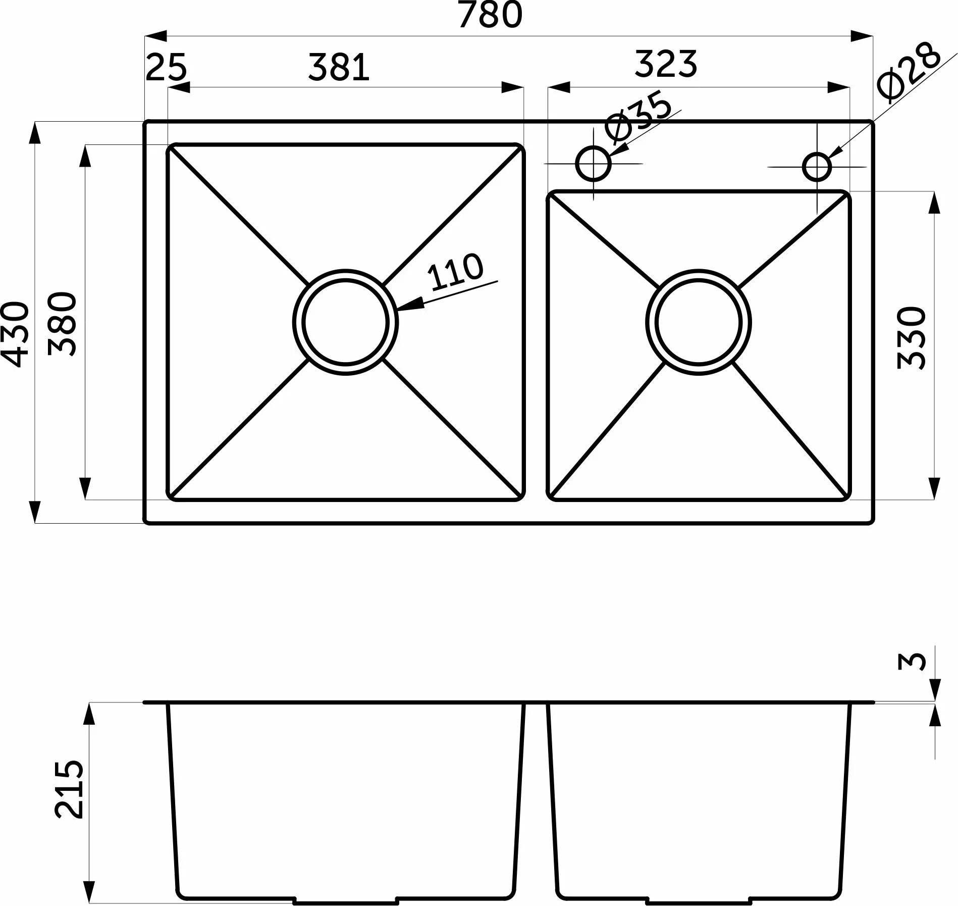 Мойка н/сталь, прямоугольная двухчашевая, 780*430мм, сатин, PVD покрытие, мойка справа, врезн на/вровень столешнице, AKS (3,2мм)