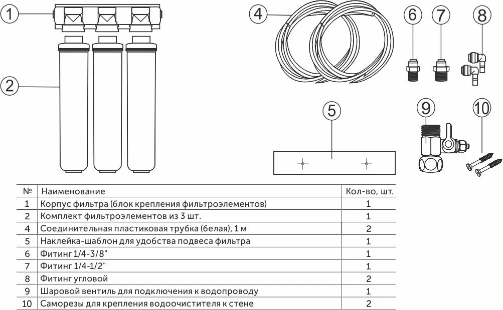 В комплекте: блок фильтра, 3 сменных картриджа, 2 соединительные трубки, комплект креплений.
