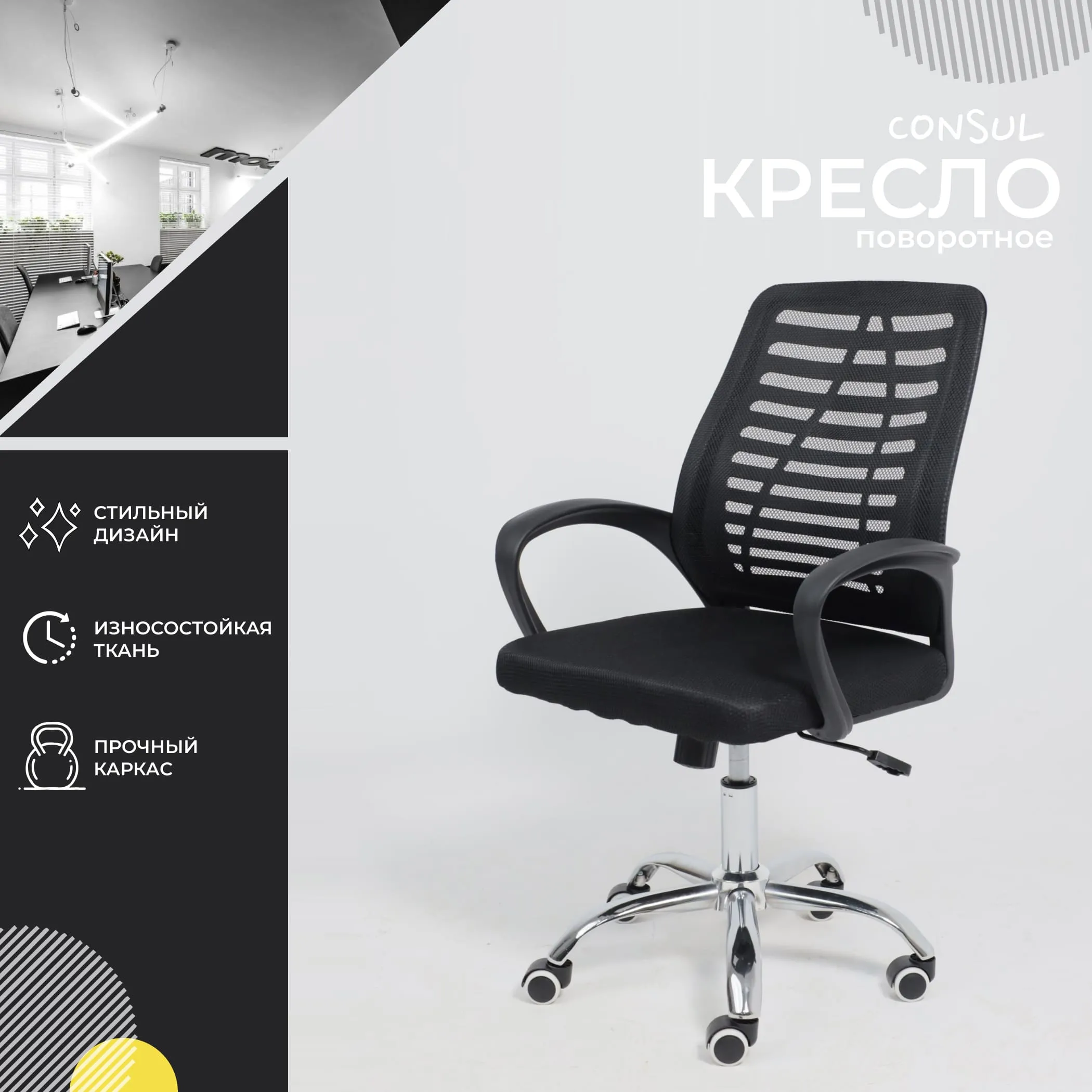 Кресло поворотное для персонала CONSUL, ткань/сетка, черный