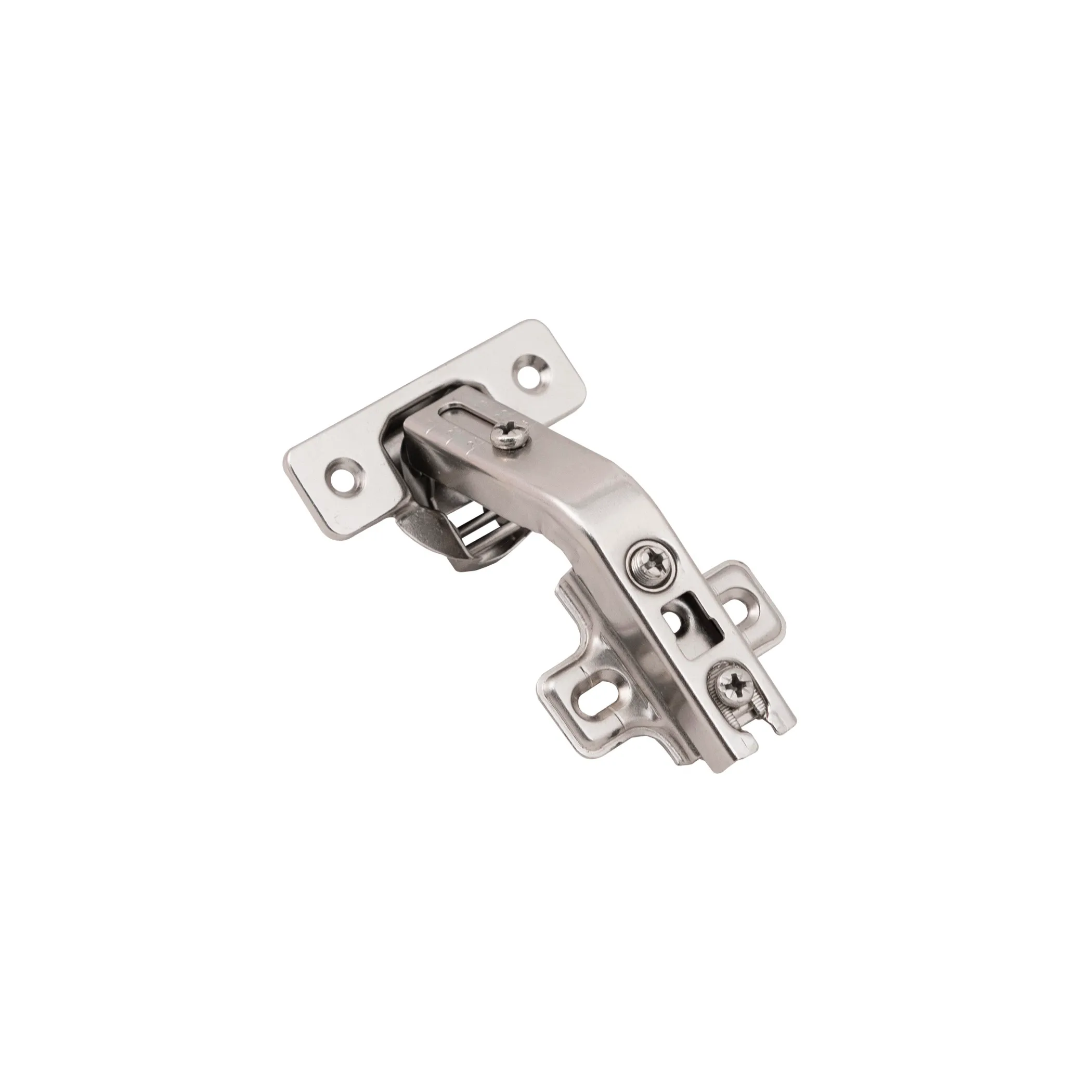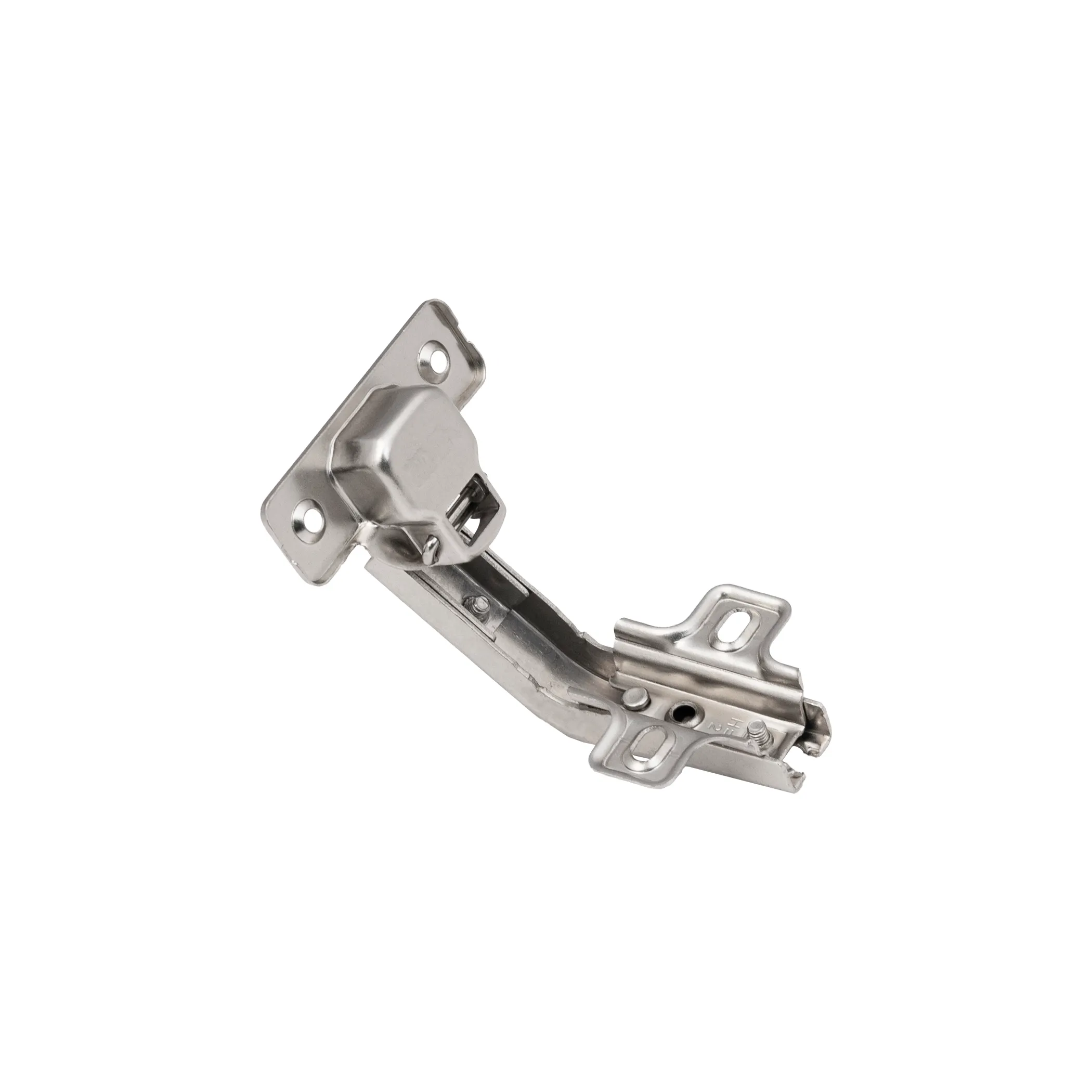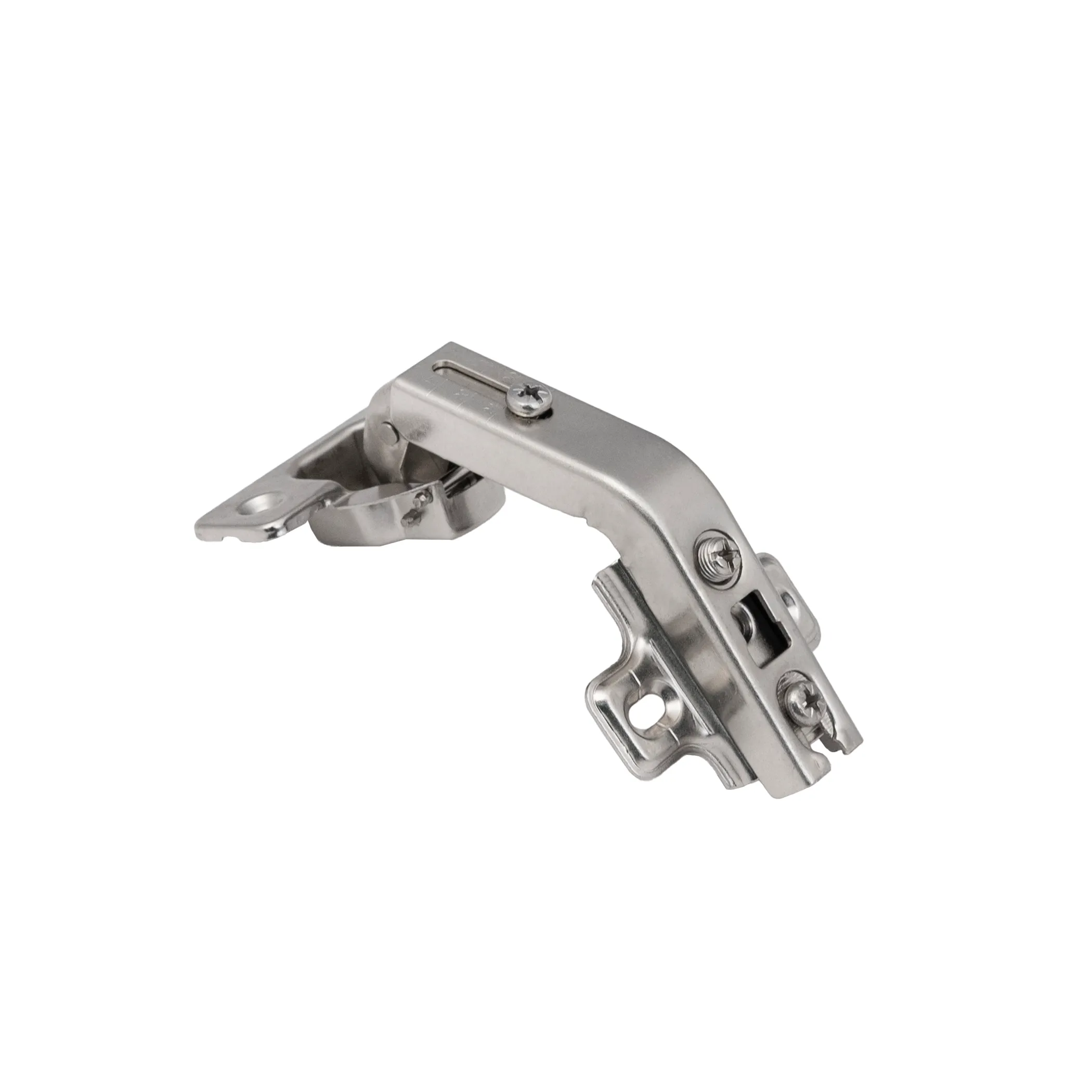 Петля угловая накладная 135 градусов карусельная с высотой планки H=2 мм. Межцентровое расстояние крепления чашки - 45 мм. Это специальный вид петли, используемый для двойных складных дверок (фасада из двух половин) в угловых открывающихся конструкциях мебельных изделий. Угол открытия - 90 гр.