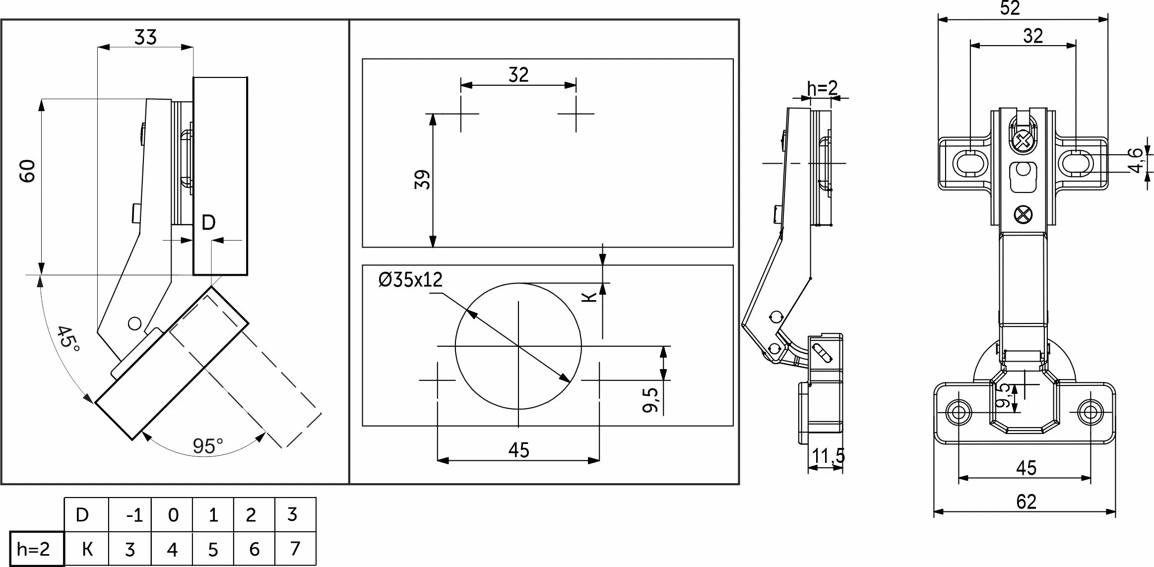| Угол открывания, ° | 95 |