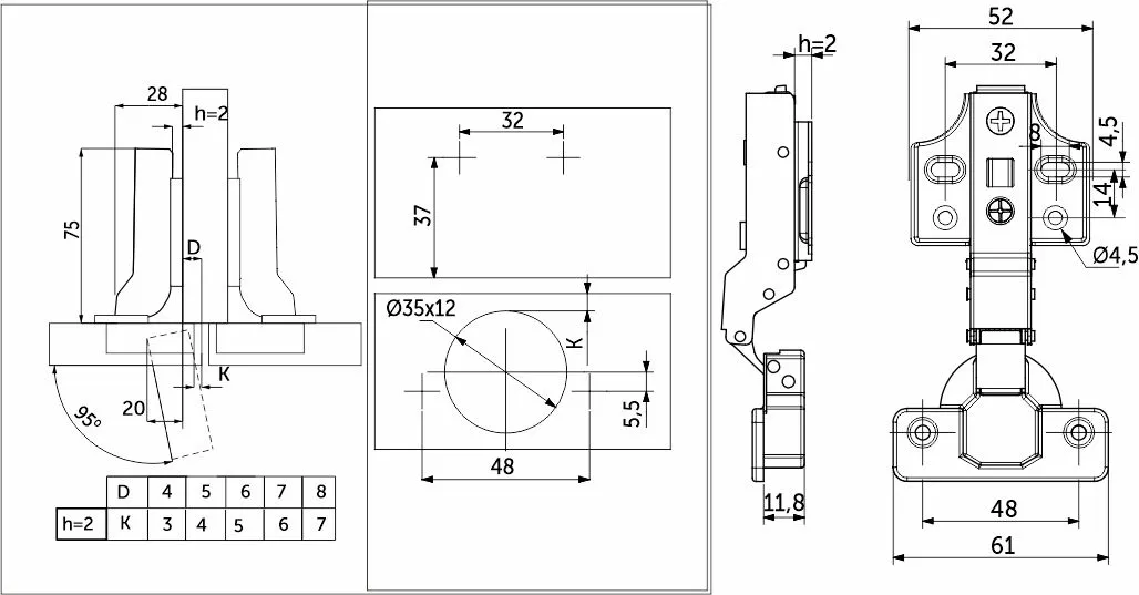 Данная петля подходит для фасадов толщиной от 15 до 28 мм, имеет межцентровое расстояние между отверстиями в чашке в 48мм, а также монтажную планку на четыре отверстия высотой h2 для более надежного крепления петли к корпусу мебели.