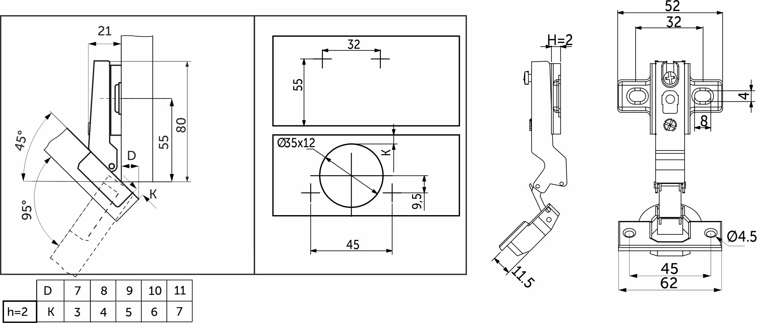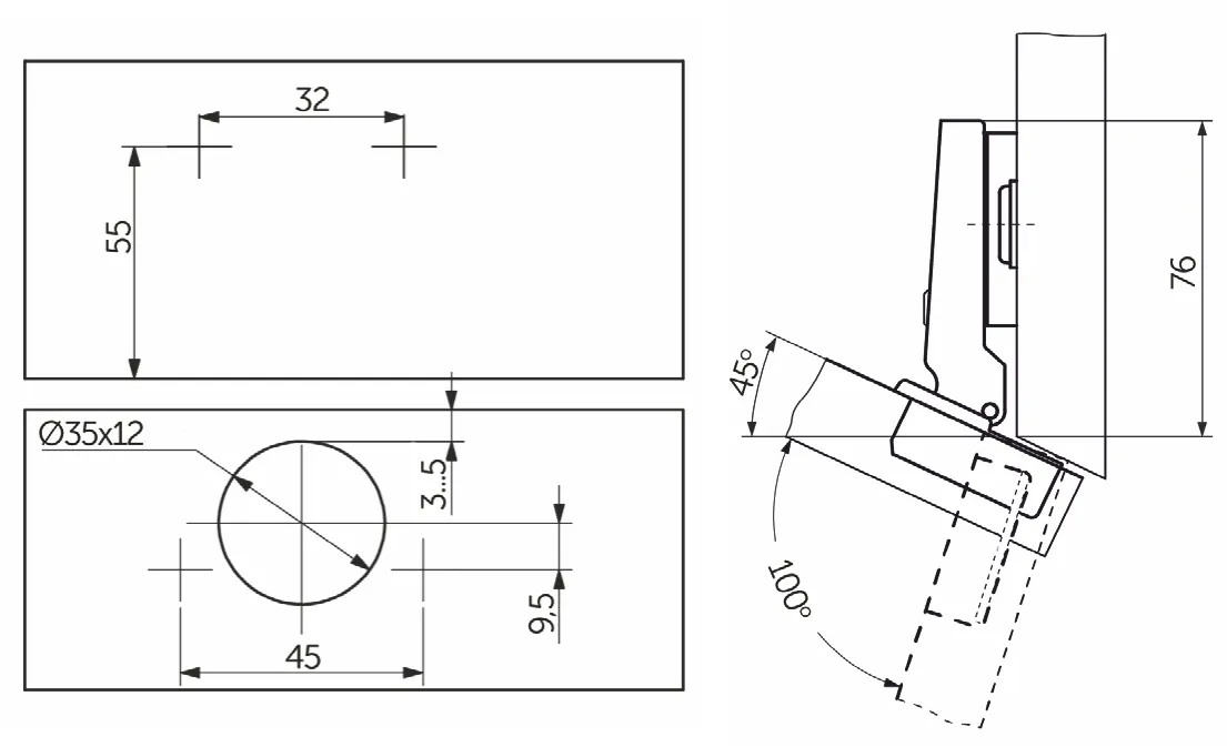 Петля угловая с системой Slide-on (надвижной монтаж) и чашкой 35 мм. Межцентровое расстояние в чашке 45 мм. Петля мебельная изготовлена из высокопрочной холоднокатаной стали. Угол открывания 100 градусов. Угол установки -45 гр. Устанавливается преимущественно под скошенные фасады угловых ящиков. Высота ответной планки Н=2 мм.