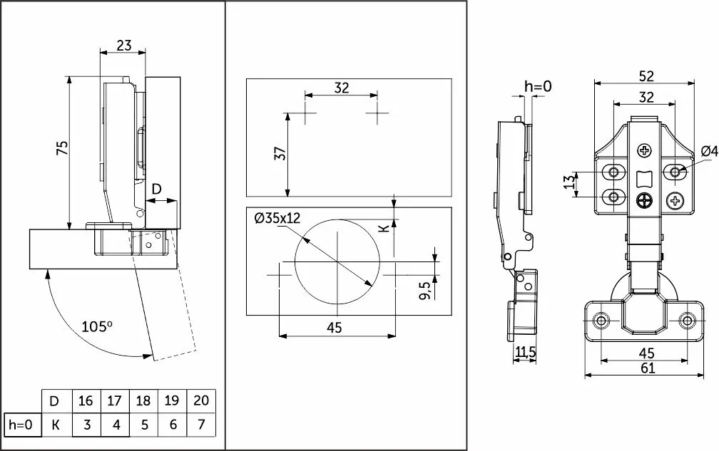 | Угол открывания, ° | 105 |