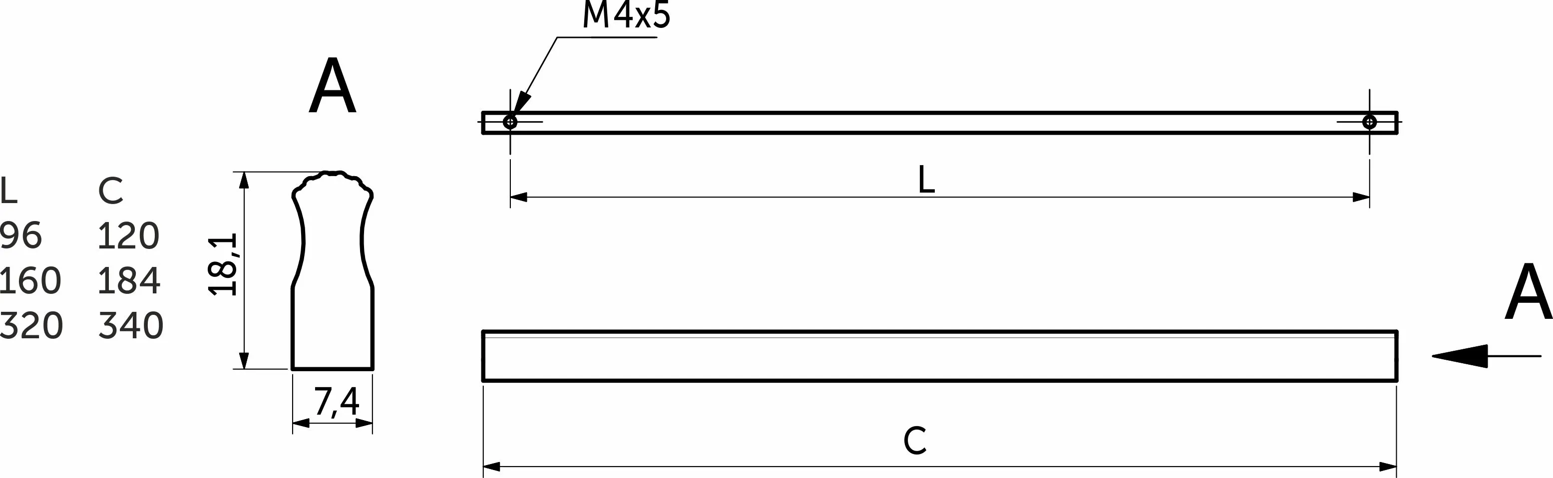 Размер 160 мм под сверление, общая длина 184мм.