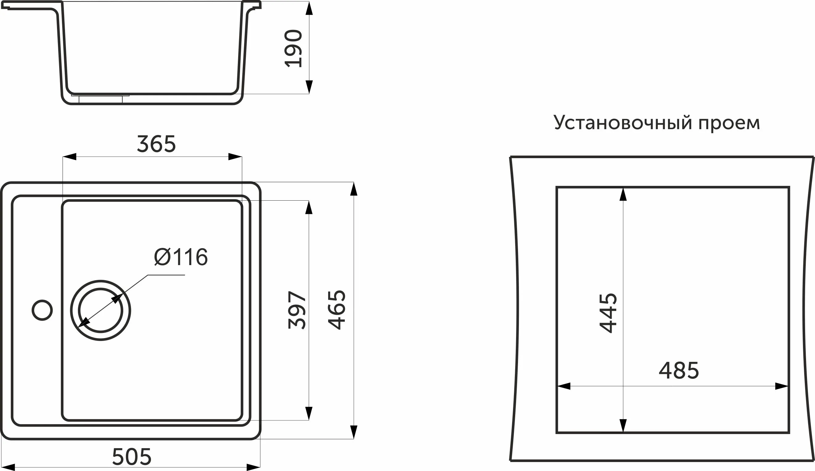 Общий размер (мм): 505 x 468. Размер чаши (мм): 380 x 350 x 190. Установочный проём (мм): 485 x 440. Кухонный блок (мм): 600