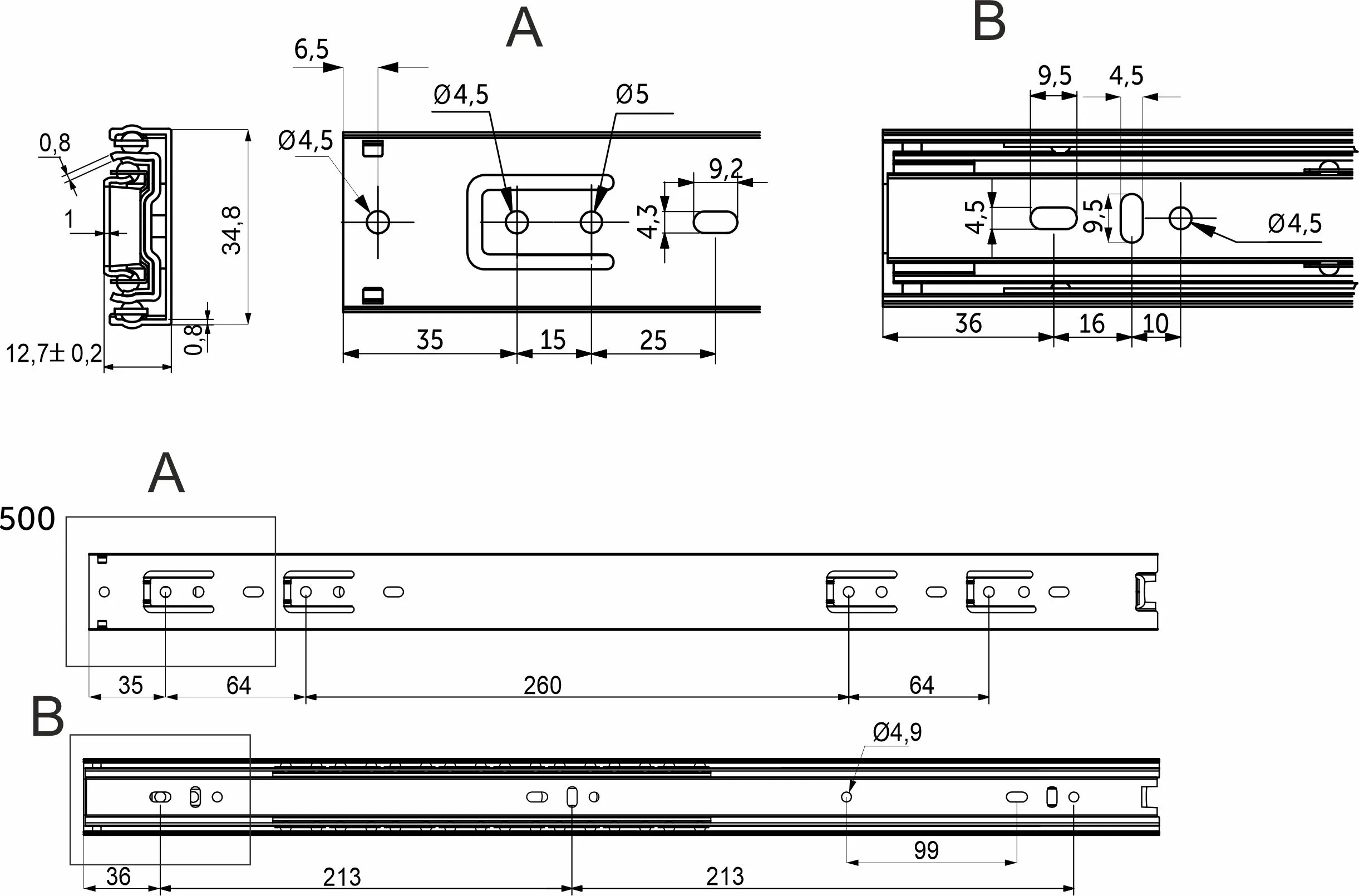 Направляющая для мебели AKS изготовлена из холоднокатаной стали толщиной 0,7*0,7*0,7 мм, имеет резиновый фиксатор от самопроизвольного открытия. Фактическая высота данной направляющей 35 мм, а её длина – 500 мм.