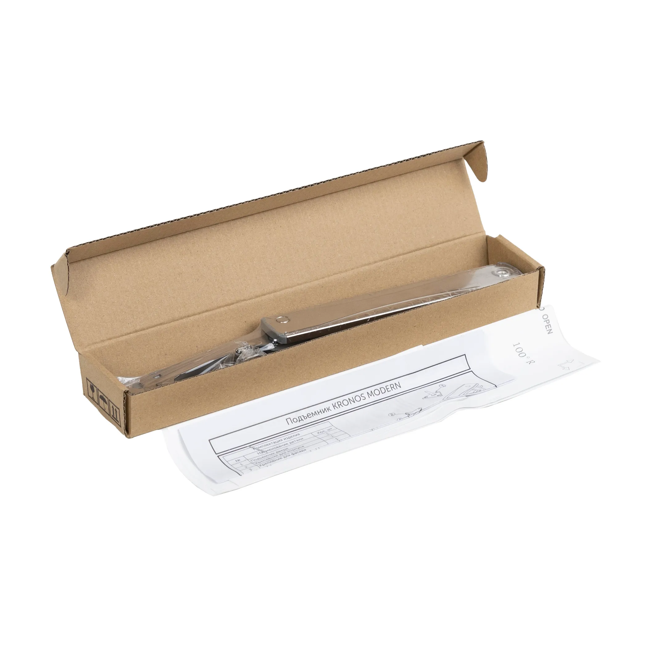 Подъемник KRONOS MODERN под механизм push-to-open предназначен для открытия фасада вверх и его фиксации в открытом положении. Он идеально подходит для сборки небольших тумб и верхних шкафов кухни, обеспечивая как удобный доступ к их содержимому, так и безопасное использование.