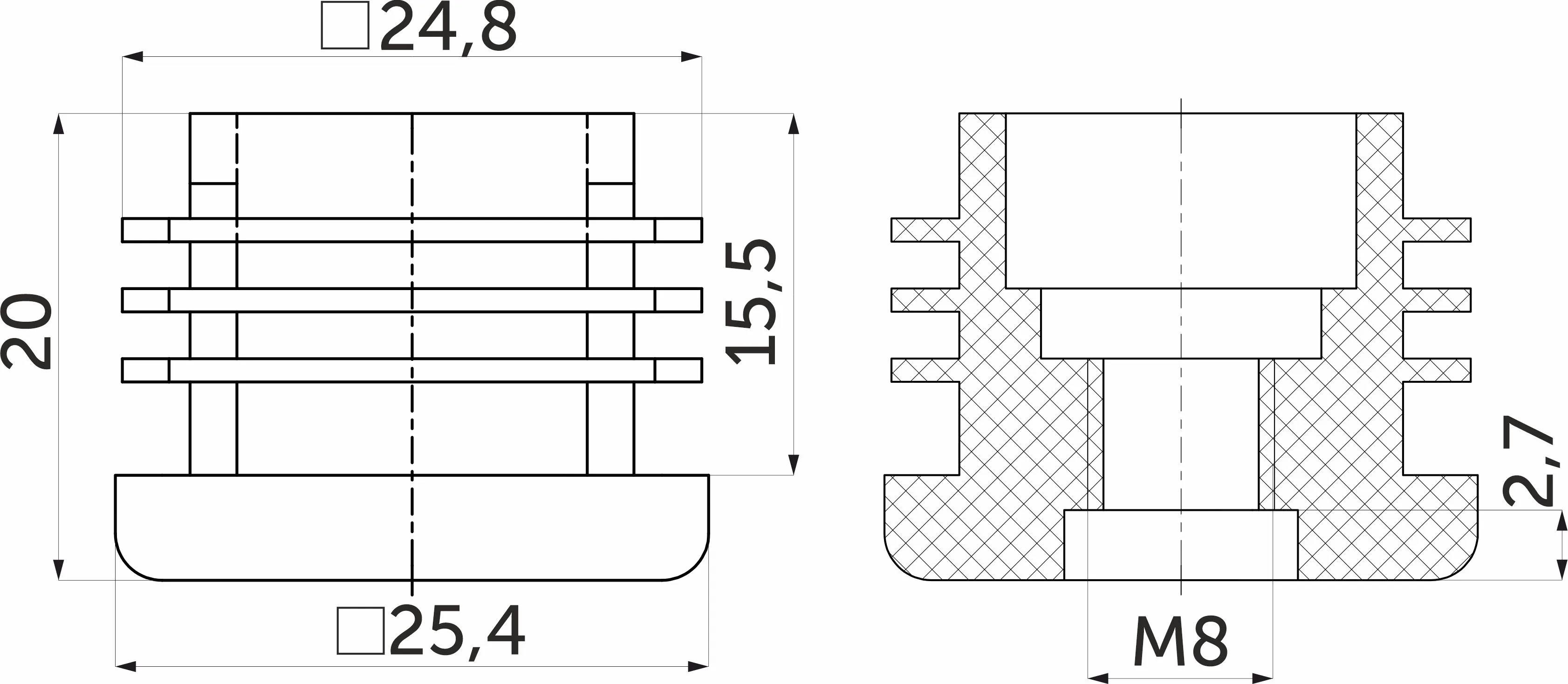 Подпятник предназначен для трубы квадратного сечения в качестве заглушки под болтом М8, а также может использоваться в качестве основания для регулируемой опоры.