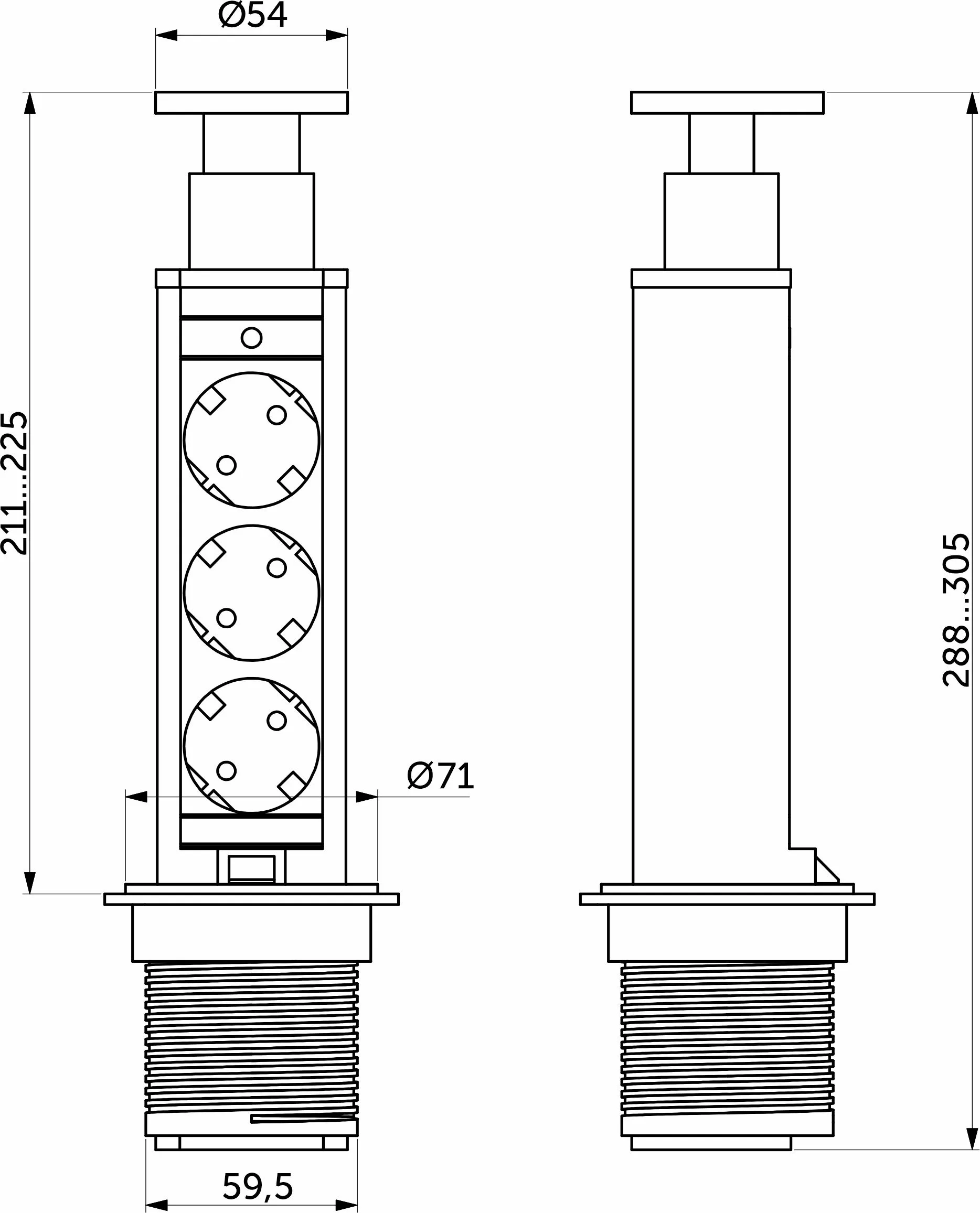 Выдвижной удлинитель Vulcan, 60 мм, 3 розетки, крышка пластик, цвет черный, AKS