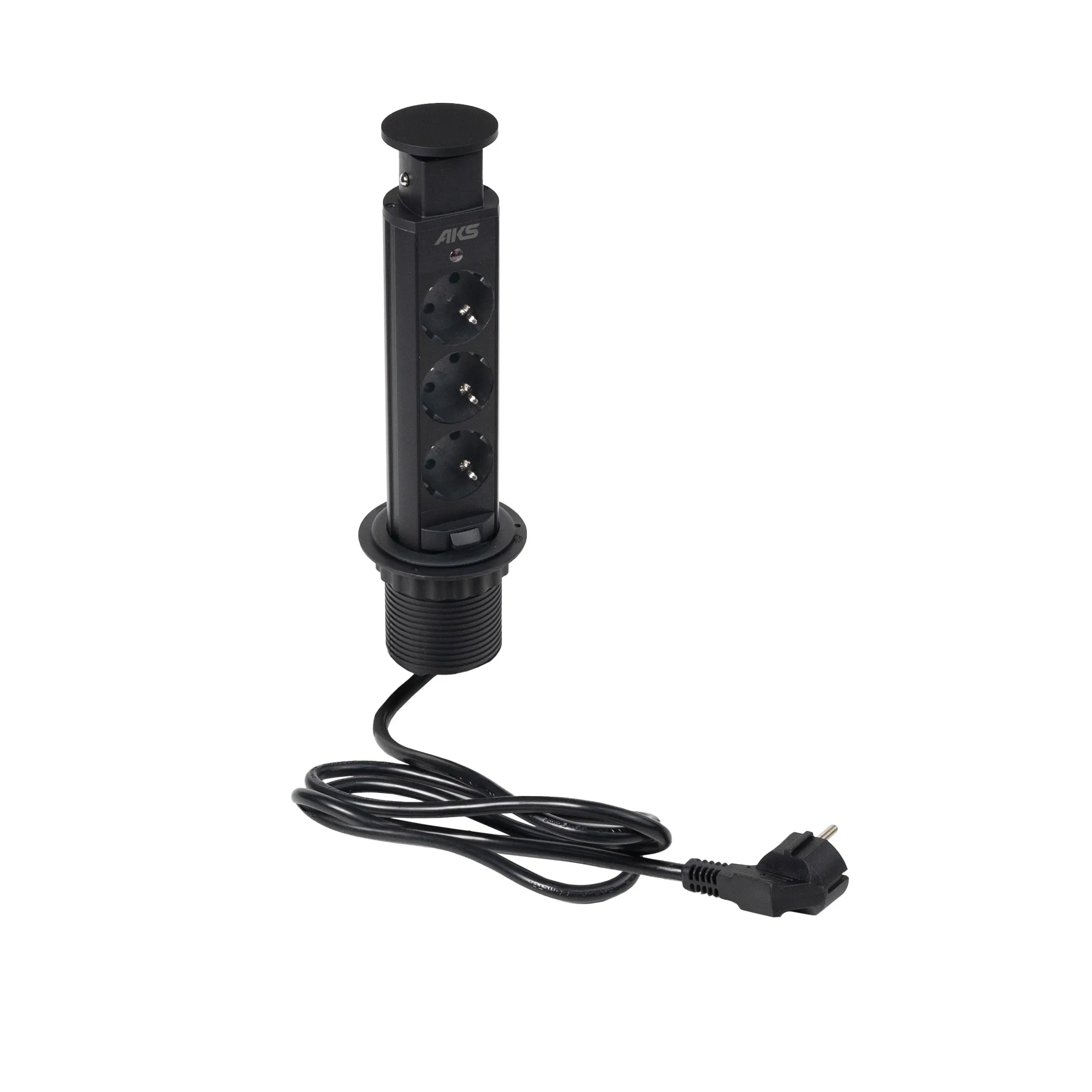 Настольный скрытый разветвитель AKS Vulcan, 60 мм 3 розетки (Schuko) цвет черный, входное напряжение 220В, выходное напряжение 220В, максимальная сила тока 16А, длина шнура 1.5м, макс. мощность 3600Вт.