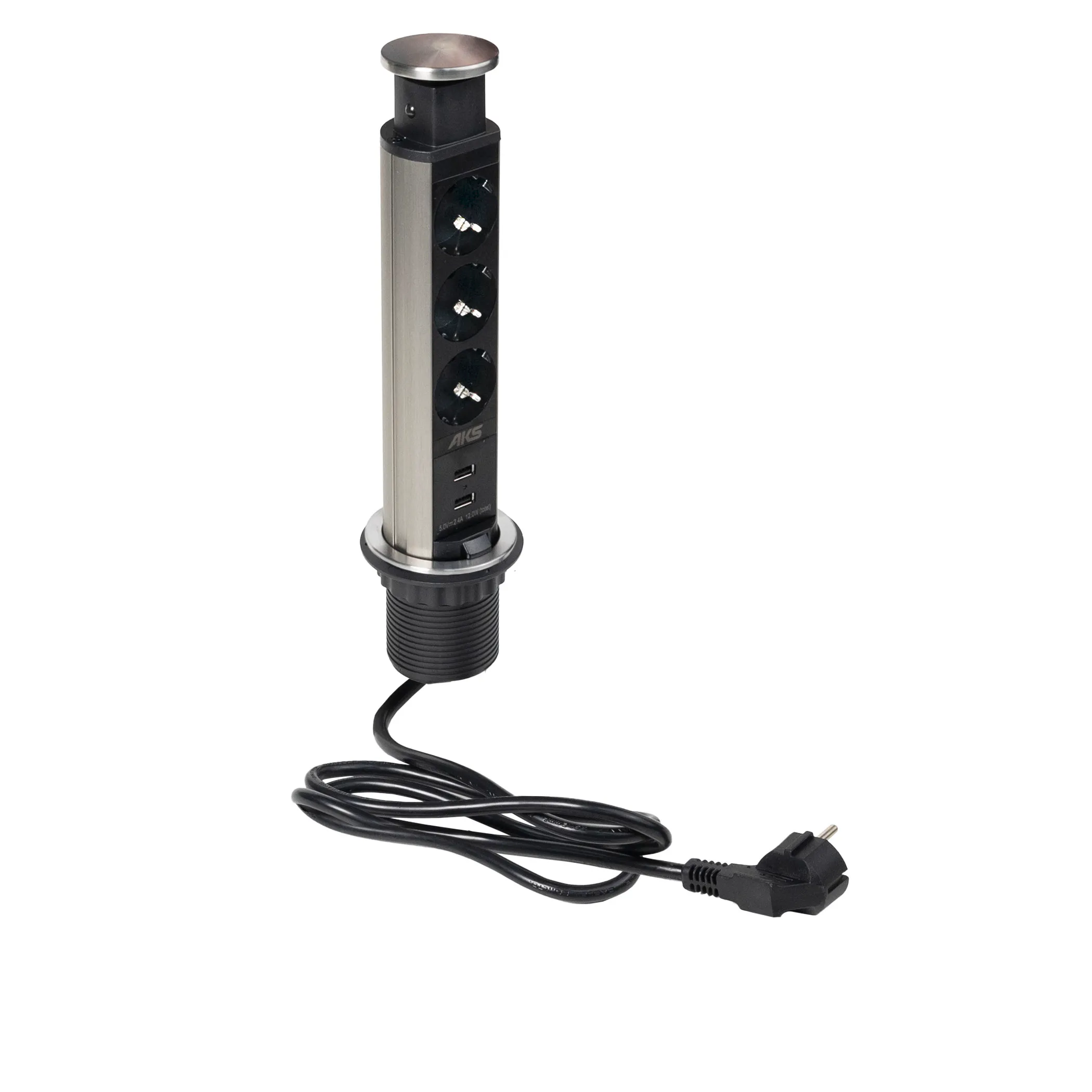 Выдвижной удлинитель Vulcan USB, 60 мм, 3 розетки 2xUSB A, крышка металл, шлиф. сталь, AKS