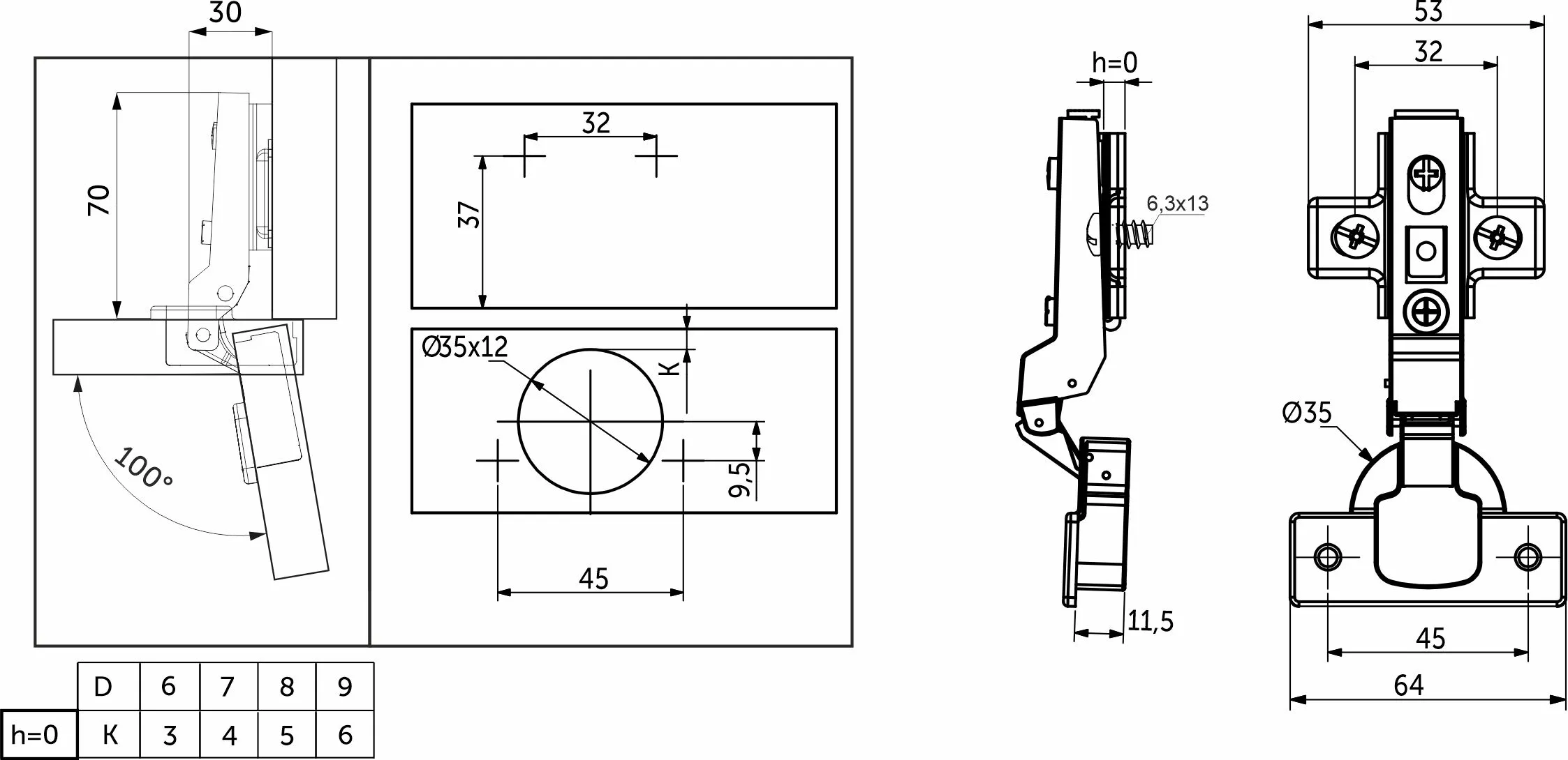 Изготовлена из холоднокатанной стали. Диаметр чашки петли составляет ∅35 мм. Глубина чашки 11,5 мм. Глубина сверления, необходимая для установки, 12 мм.