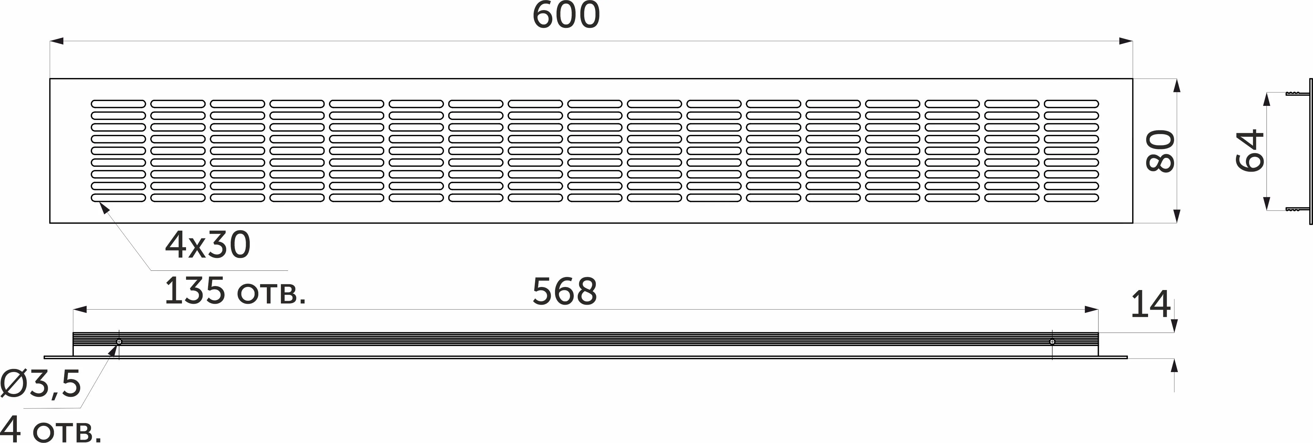 Вентиляционная решетка, материал - алюминий, габариты лицевой части - 600х80 мм. Посадочные - 568х64 мм.
