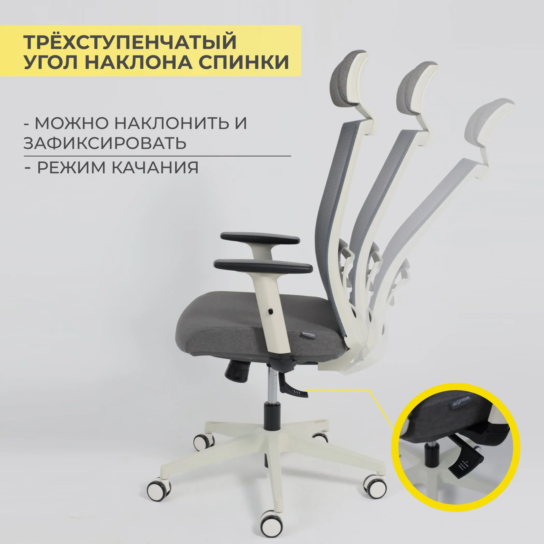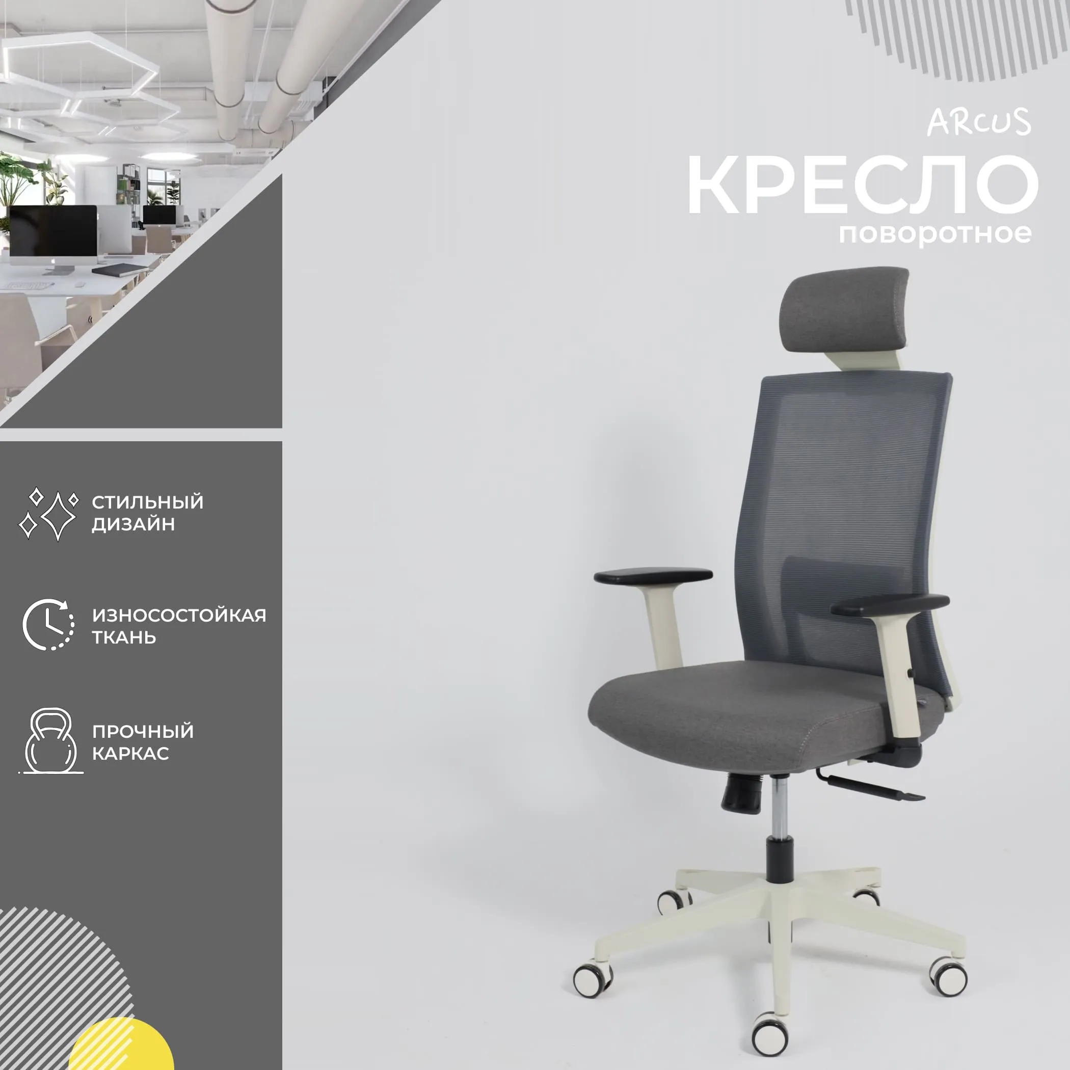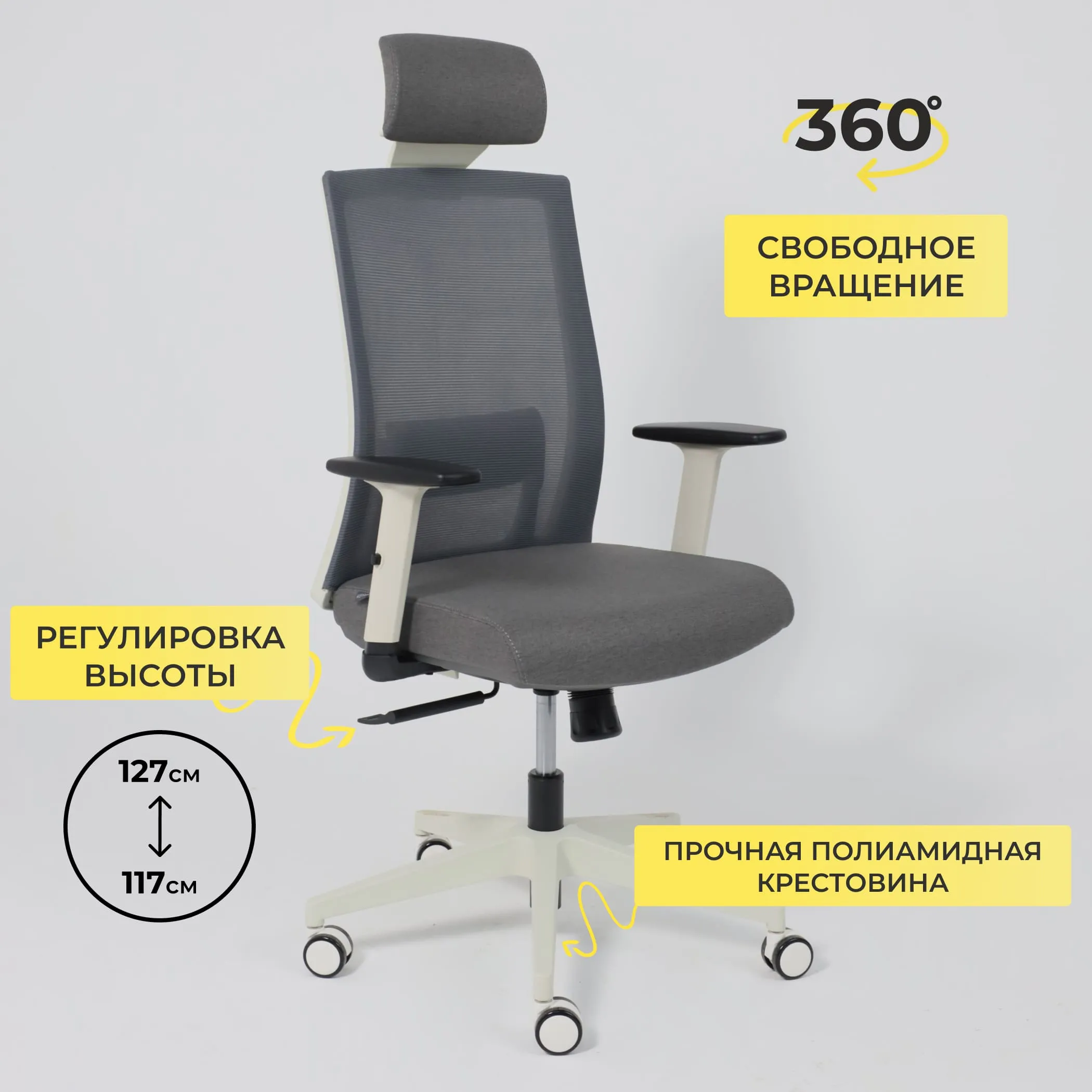 Кресло поворотное ARCUS, серая сетка+ткань/белый полиамид, коллекция AKSPRIME
