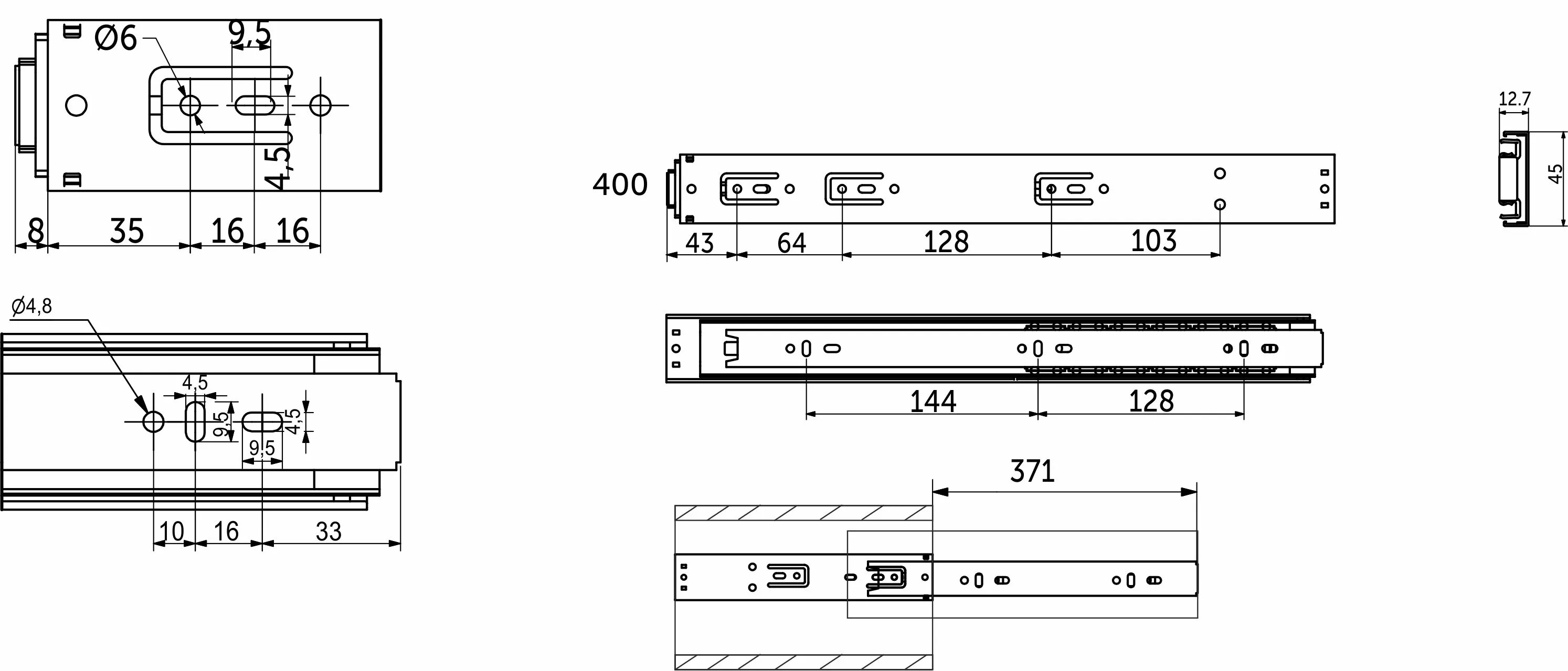 Представлены в широком диапазоне длин: от 250 до 600 мм (с шагом 50 мм). Направляющая длиной L-400 мм имеет потерю выдвижения в 29 мм.