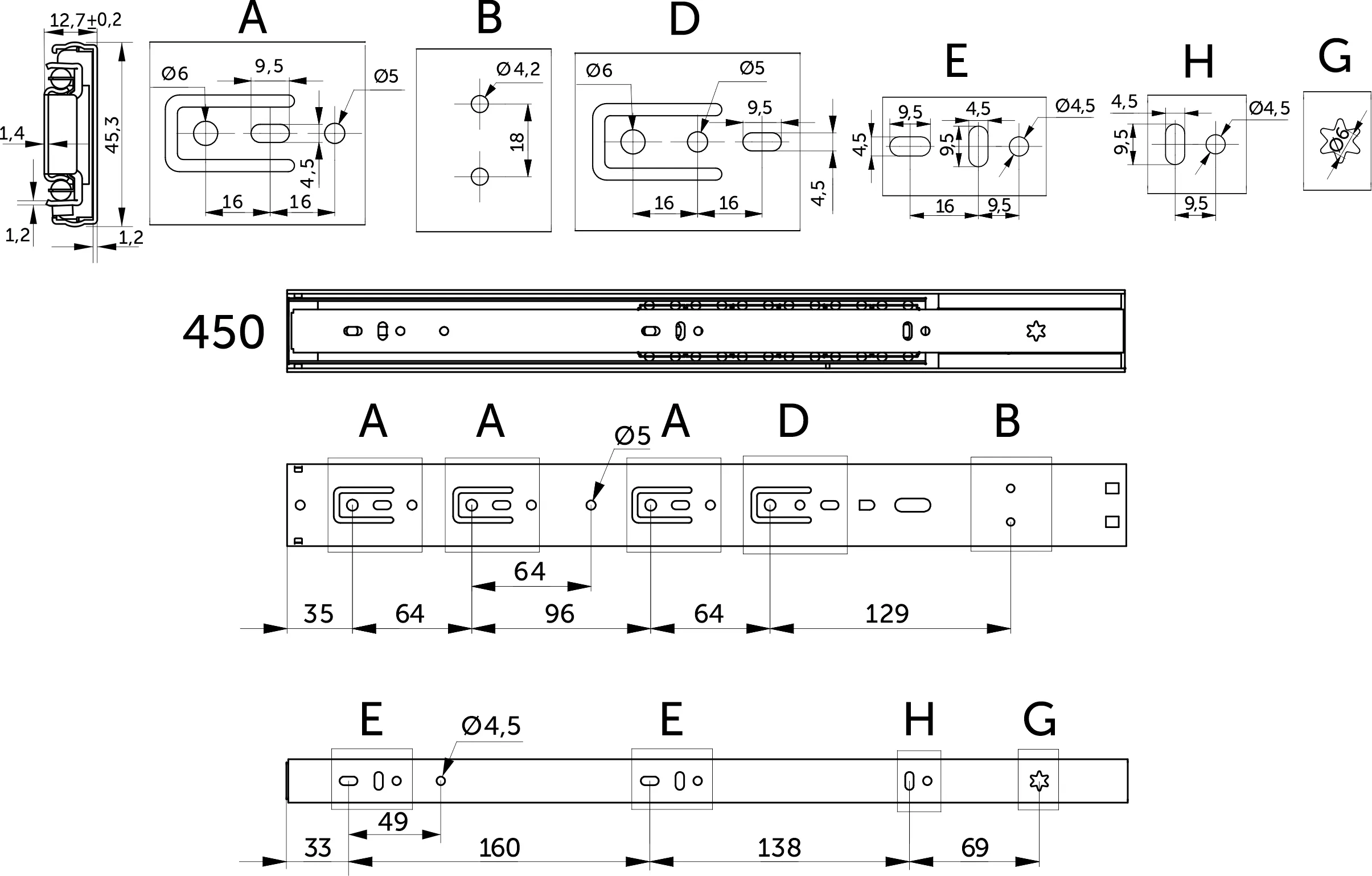 Представлены в широком диапазоне длин: от 250 до 600 мм (с шагом 50 мм), с полным выдвижением, начиная с длины 300 мм.