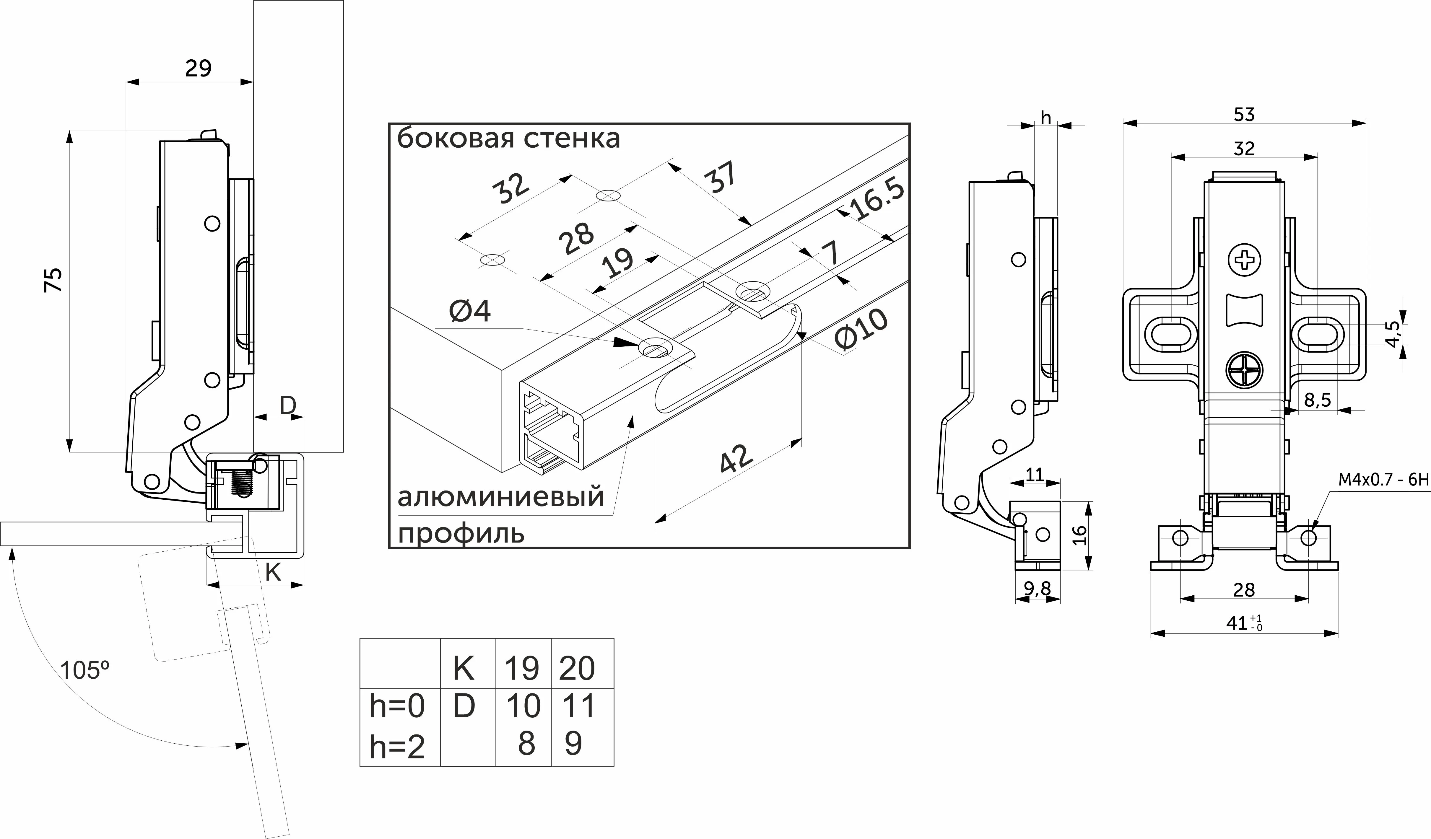 | Угол открывания, ° | 105 |