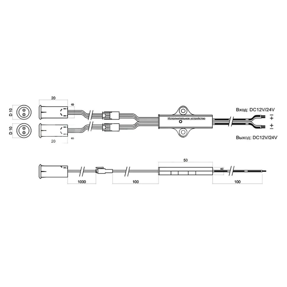 Минимальный диаметр датчика допускает установку в полку толщиной от 10 мм. Провод от датчиков до выключателя L=1м с разъемами.