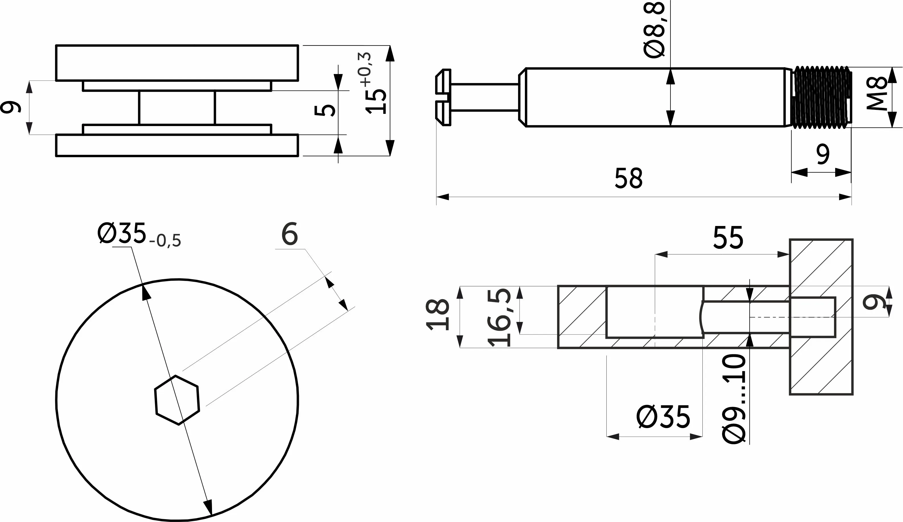 Фиксация происходит при помощи шестигранного ключа 6мм. Шток М8, толщина эксцентрика 16мм для панелей от 18мм.