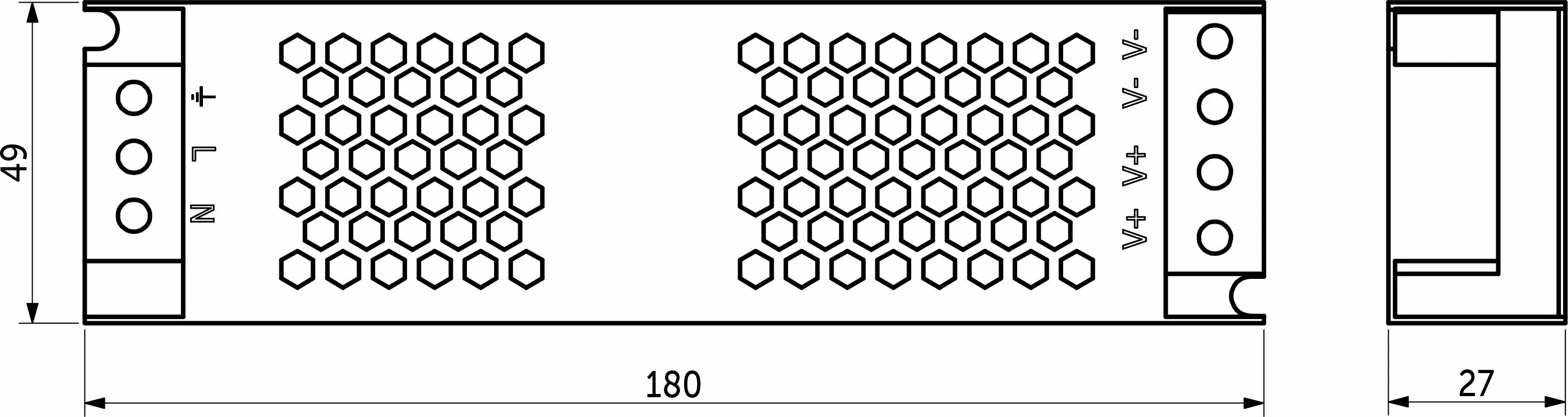 Размеры 180х48х27мм. Вх.напряж. 110-220V AC, вых напряж. 24V DC, мощность 100Вт, сила тока 4.17A, степень защиты IP20.