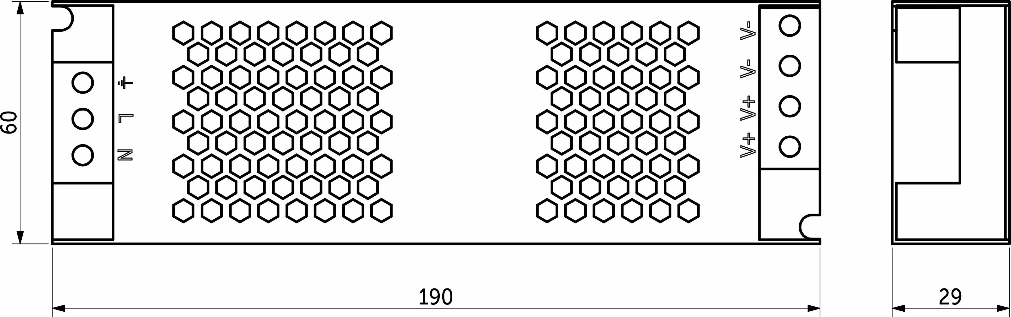 Размеры 190х60х29мм.Вх.напряж. 110-220V AC, вых напряж. 24V DC, мощность 150Вт, сила тока 6.25A, степень защиты IP20.
