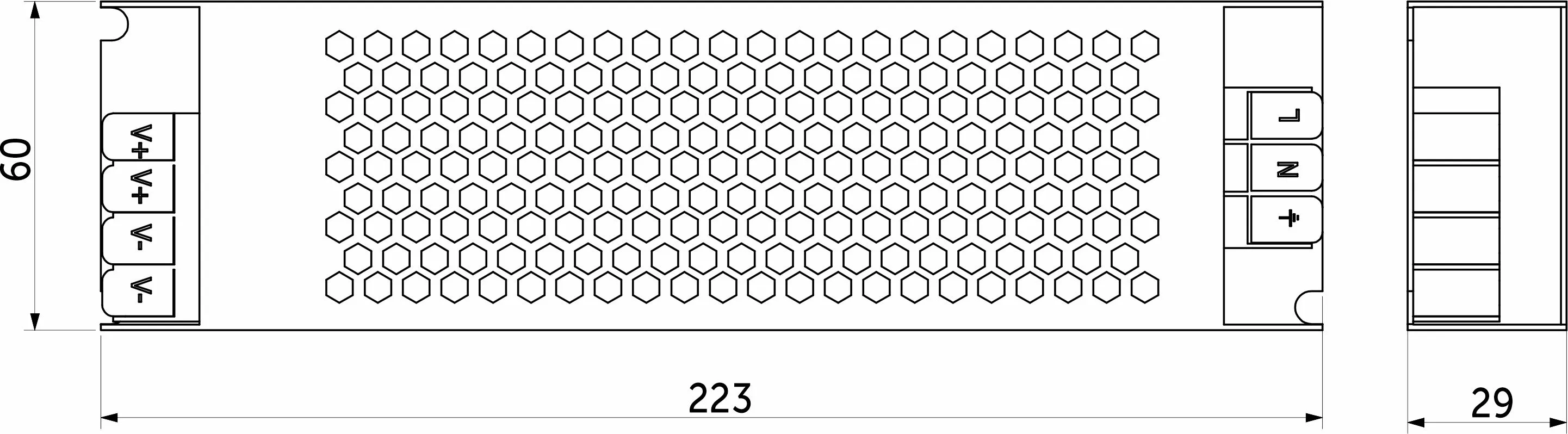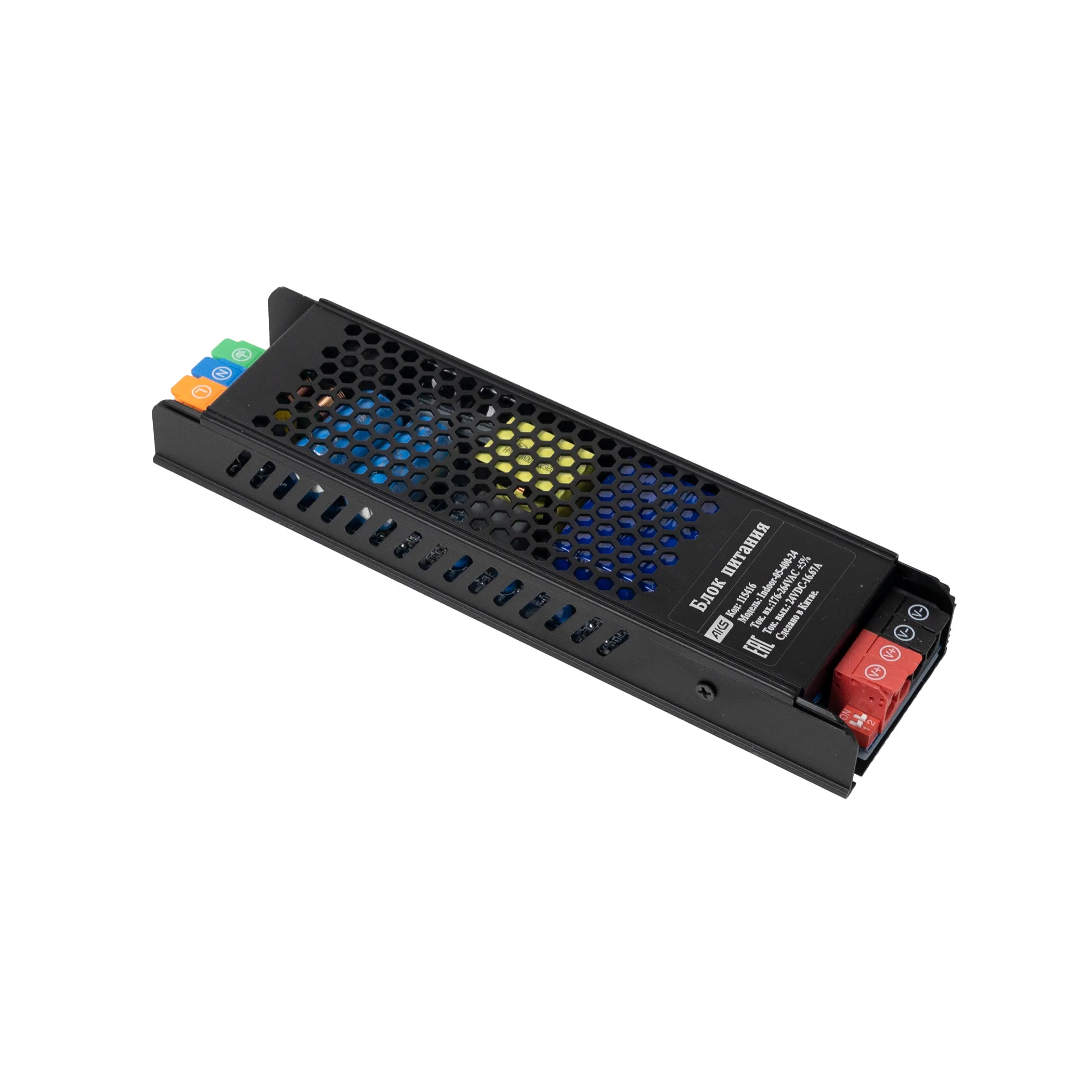 Размеры 223х60х29мм. Вх.напряж. 110-220V AC, вых напряж. 24V DC, мощность 400Вт, сила тока 16.67A, степень защиты IP20.