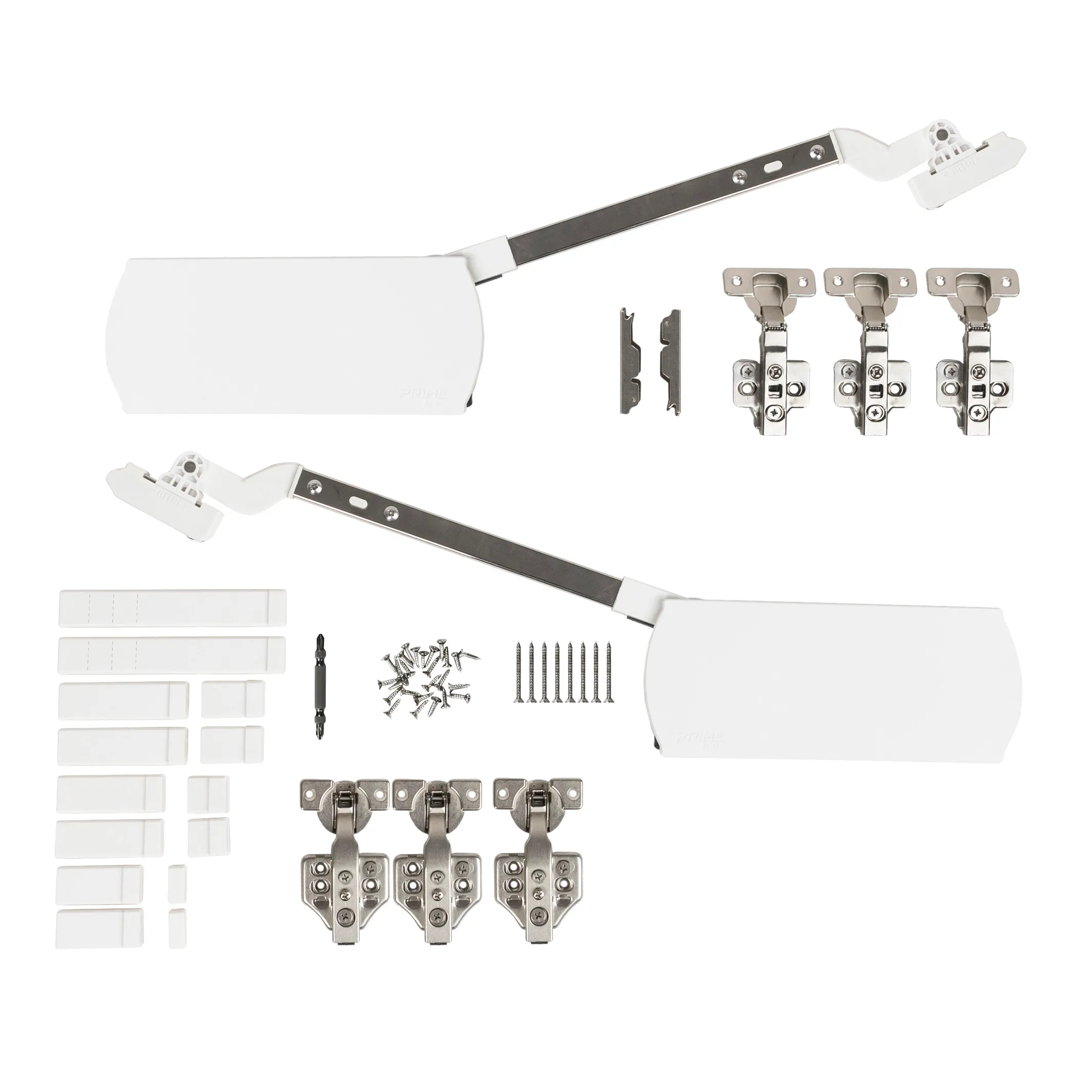 В комплект входят: подъемный механизм (2 шт.), пластиковые заглушки (2 шт.), крепление фасада (2 шт.), бита (1 шт.), верхняя петля (3 шт.), промежуточная петля для предотвращения защемления пальцев (3 шт.), саморезы 3,6х16 мм (37 шт.), саморез 4х40 мм (8 шт.), декоративные заглушки плеча, комплект шаблонов для установки, инструкция по установке.