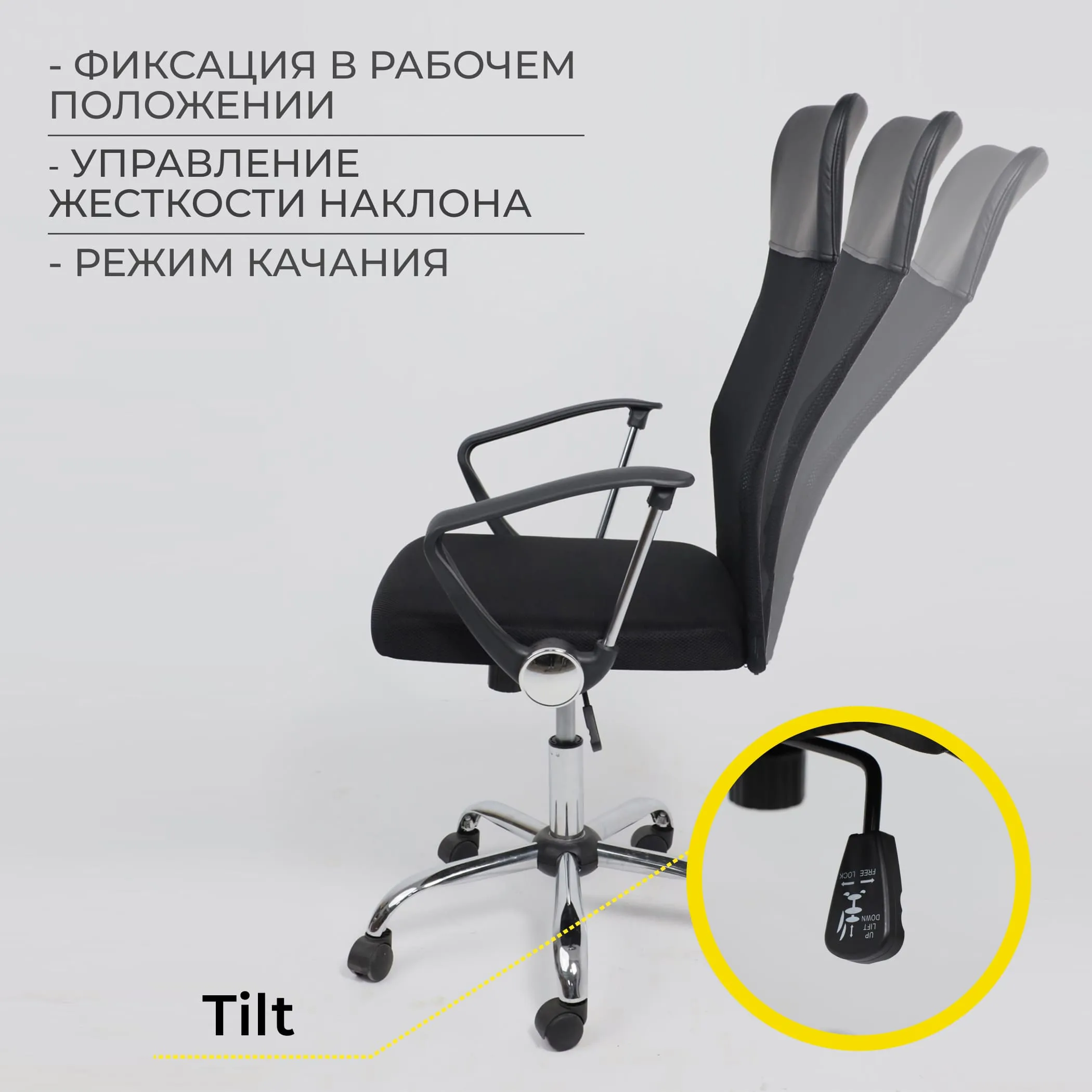 | Механизм регулировки | Tilt Tilt - позволяет зафиксировать положение сидящего в кресле, также есть управление жесткости наклона: мягче или жестче наклон под вес пользователя. Управление механизмом Tilt осуществляется с помощью одного рычага, расположенного в нижней части под сиденьем кресла. |