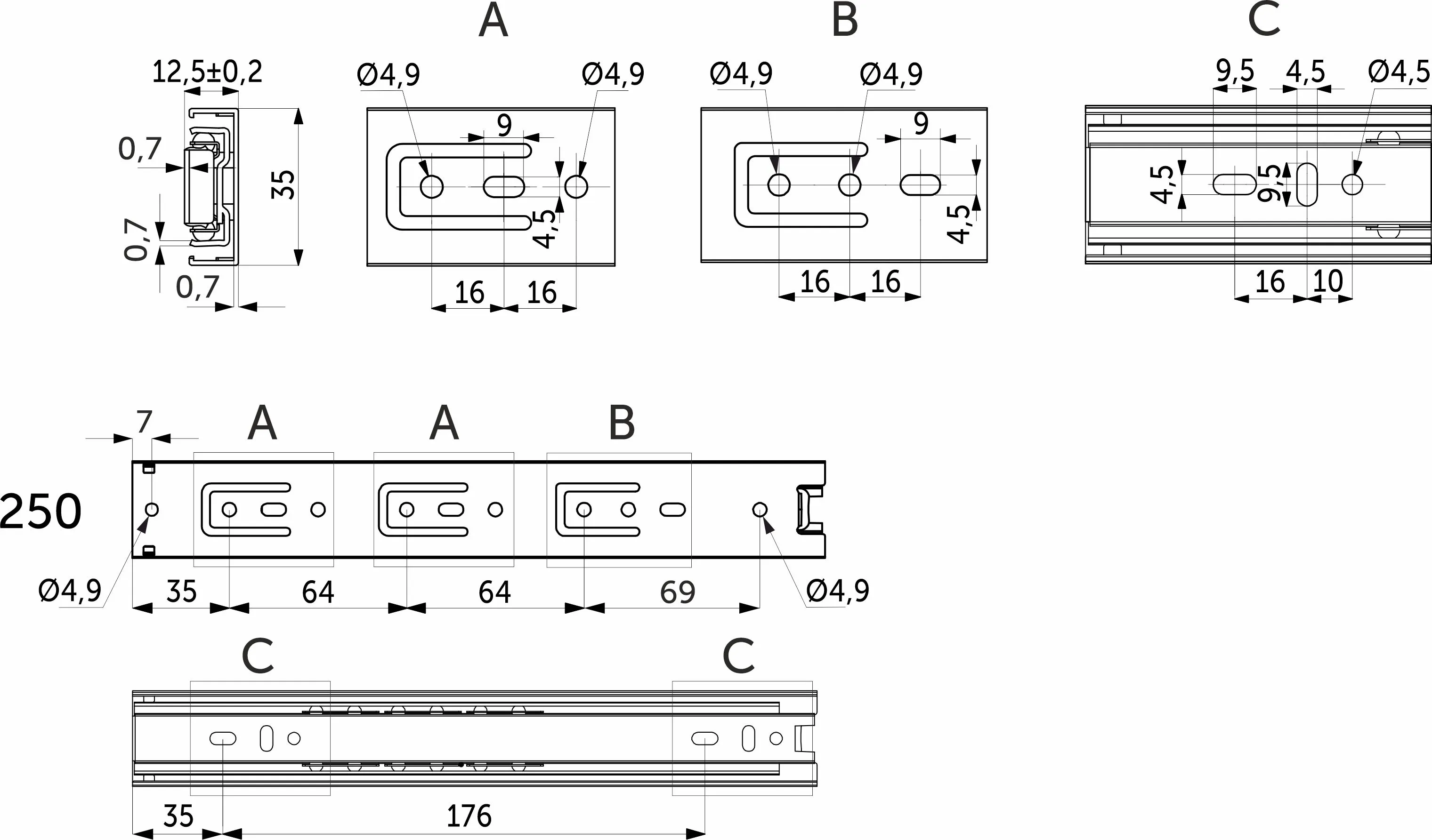 Направляющая для мебели AKS изготовлена из холоднокатаной стали толщиной 0,7*0,7*0,7 мм, имеет резиновый фиксатор от самопроизвольного открытия. Фактическая высота данной направляющей 35 мм, а её длина – 250 мм.