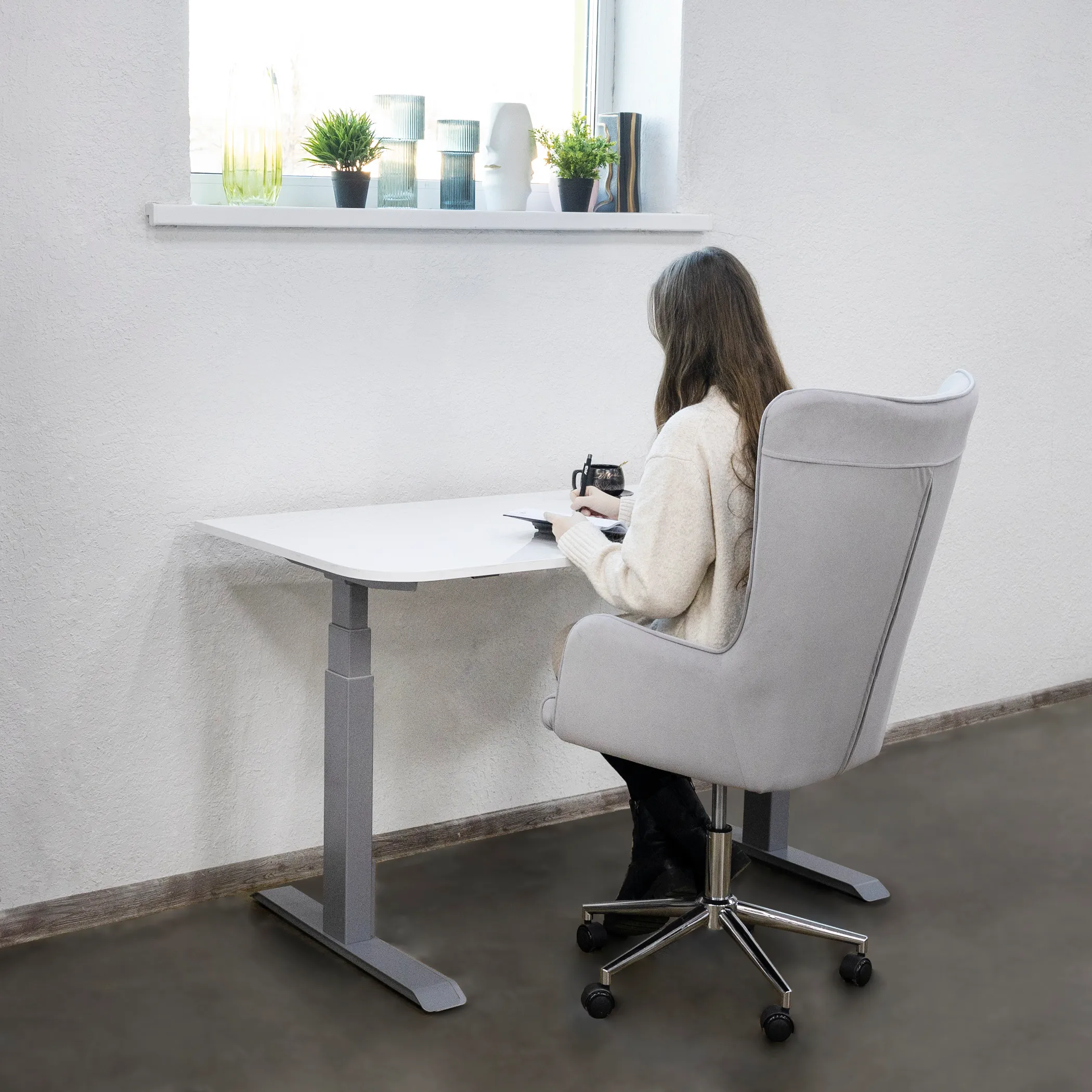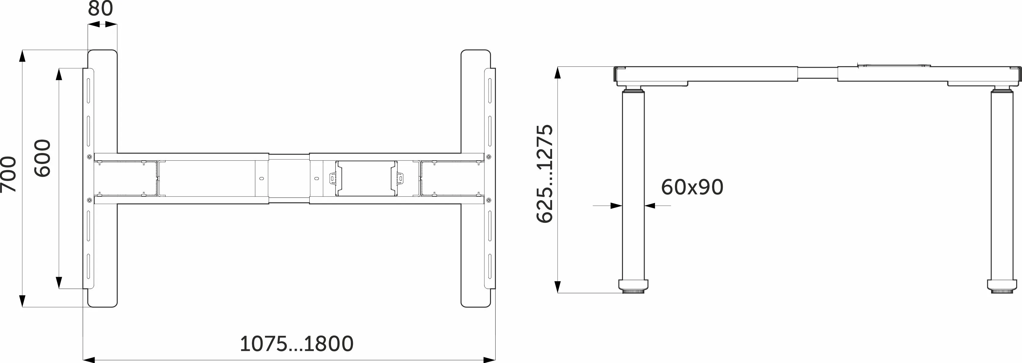 Регулировка высоты подстолья от 625 до 1275 мм, регулировка ширины от 1075 до 1800 мм (память высоты в 3-х положениях). В подстолье встроено 2 разъема USB (USB type A + USB type C), 2 двигателя, гарантирующие стабильную работу опор. Входная мощность 110-230 V, максимальная скорость 40 мм/сек. Нагрузка до 120 кг. Протестировано на 80 000 рабочих циклов.