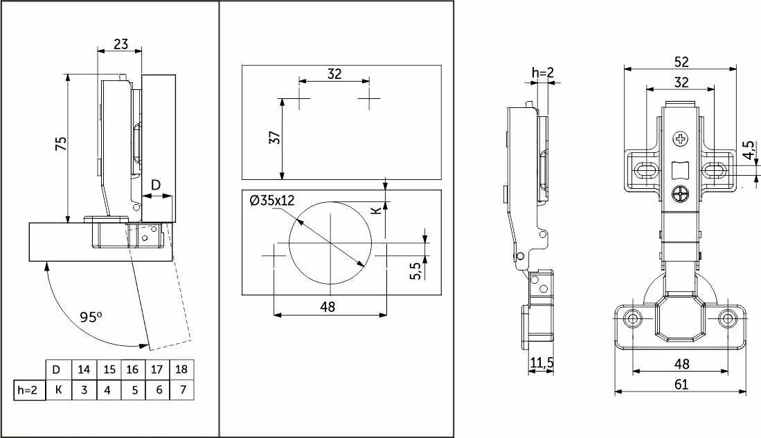 | Угол открывания, ° | 105 |