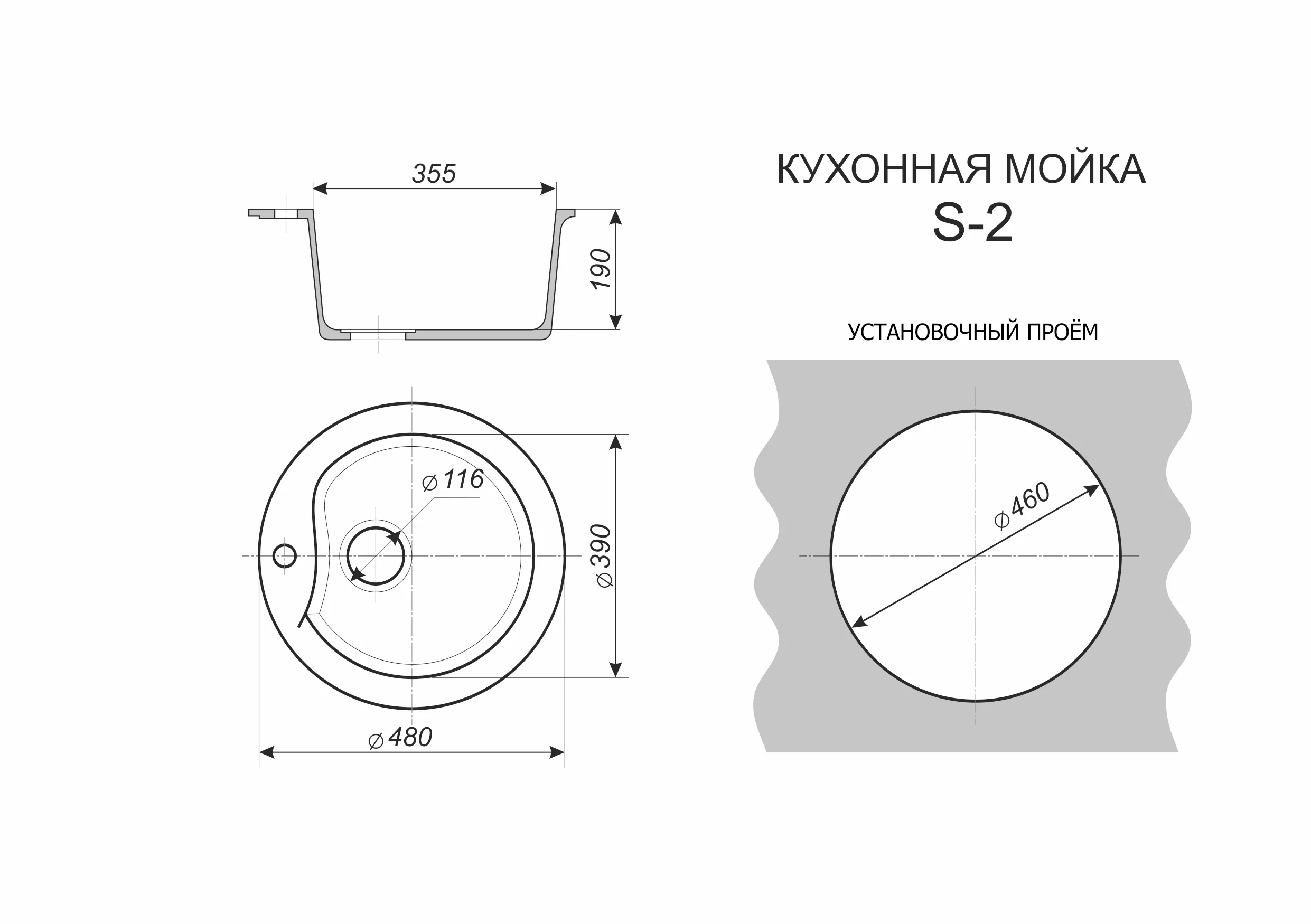 Мойка каменная, круглая одночашевая, S-2, d460 мм, асфальт, врезная, Sim Gran
