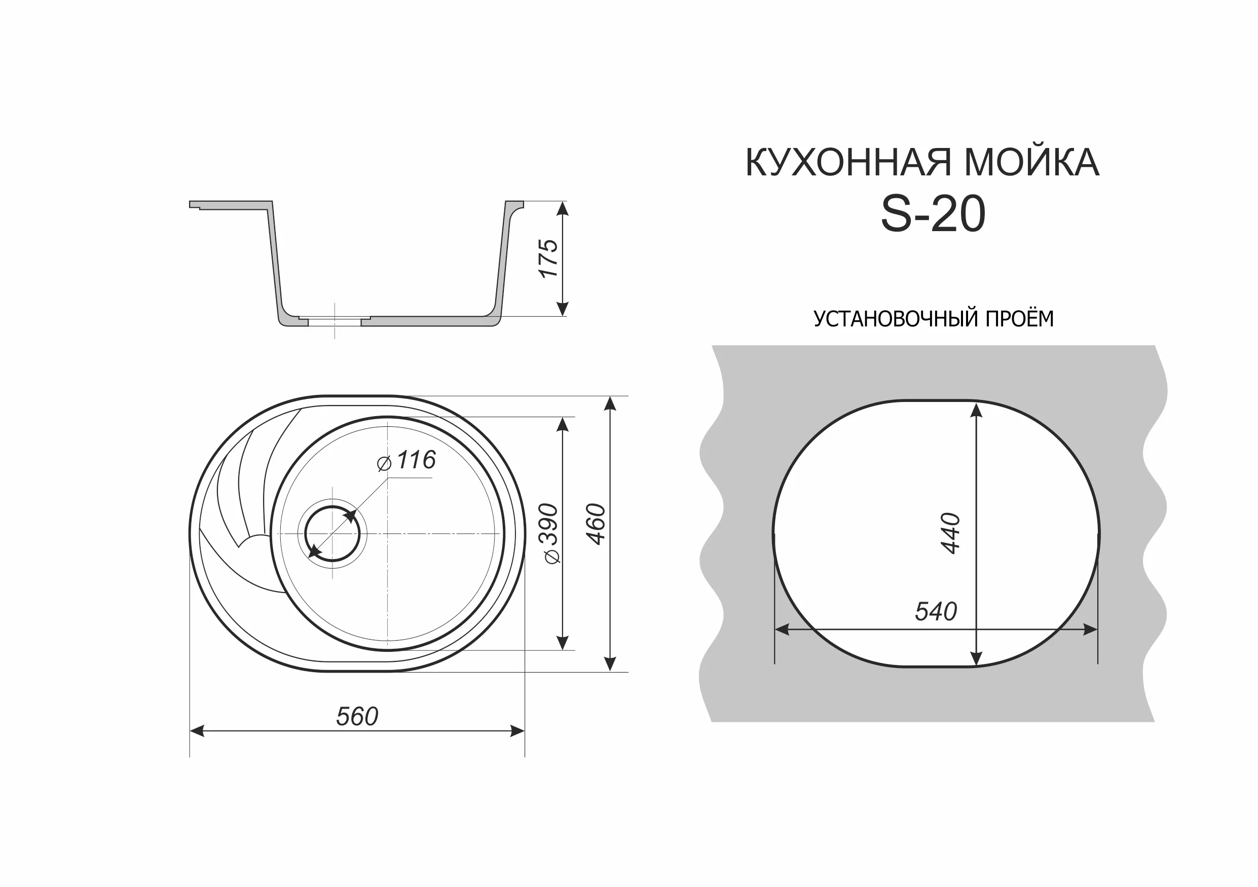 Мойка каменная, овальная одночашевая с крылом, S-20, 560*460мм, асфальт, врезная, Sim Gran